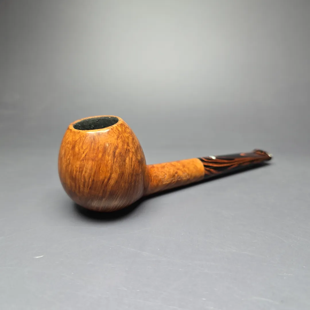 While high-grade Italian pipes, as with most other contemporaneous high-grade pipes, were originally fitted with ebonite stems (including Castello), for a long time in the post-war decades, the gold standard for a good mouthpiece was, instead, Lucite. Castello, Mastro de Paja, Caminetto, Ser Jacopo, Radice, Il Ceppo, Ascorti, and many others hand-cut their stems from Lucite of various hues. It is only relatively recently that ebonite has returned to the Italian high-grades scene, at least in its most historic workshops, and it remains the exception, rather than the rule. I mention this because this particular Caminetto, an apple, or anse, shape in the make’s Natural finish, is one of those rare examples of a Caminetto with a genuine cumberland mouthpiece—something perfect for those who enjoy well-made Italian pipes but prefer the brindled tones and softer feel and comfort that only ebonite affords.