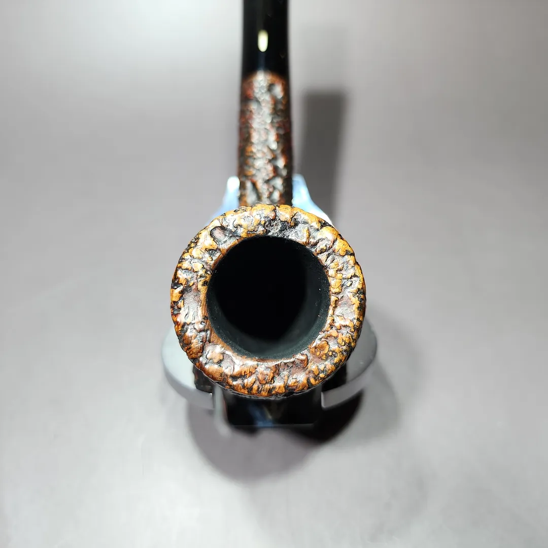 The Sea Rock Briar may well be Castello’s most important—and popular—contribution to the world of pipes. Along with Savinelli’s Corallo, it inaugurated an enduring tradition of pebble-dash finishes in Italian pipes and beyond, and in doing so dispelled any doubt that rustication precluded a pipe from being high-grade. This pipe is just such an example, but it’s a little more than that. It is not only a Castello Sea Rock Briar, it is a Castello Sea Rock Briar from some of the earliest years of their production. The stamping features the trademark registration number that was common for early Castello pipes, but unlike other “reg era” Castellos, it does not feature any kind of size code. In the late 1950, Carlo Scotti began using a grading system that corresponded to the size and/or grain quality (depending on the finish) of Castello pipes, in the format (ascending) “SA, SB, SC,” etc. Around 1970, this format was switched to an uppercase “K” system; in 1982, this format was switched again to the current, lowercase “k” system. This, along with the more rugged, naturalistic style of the Sea Rock finish, would indicate that the pipe is an early 1950s model, making it a real collectors’ piece.