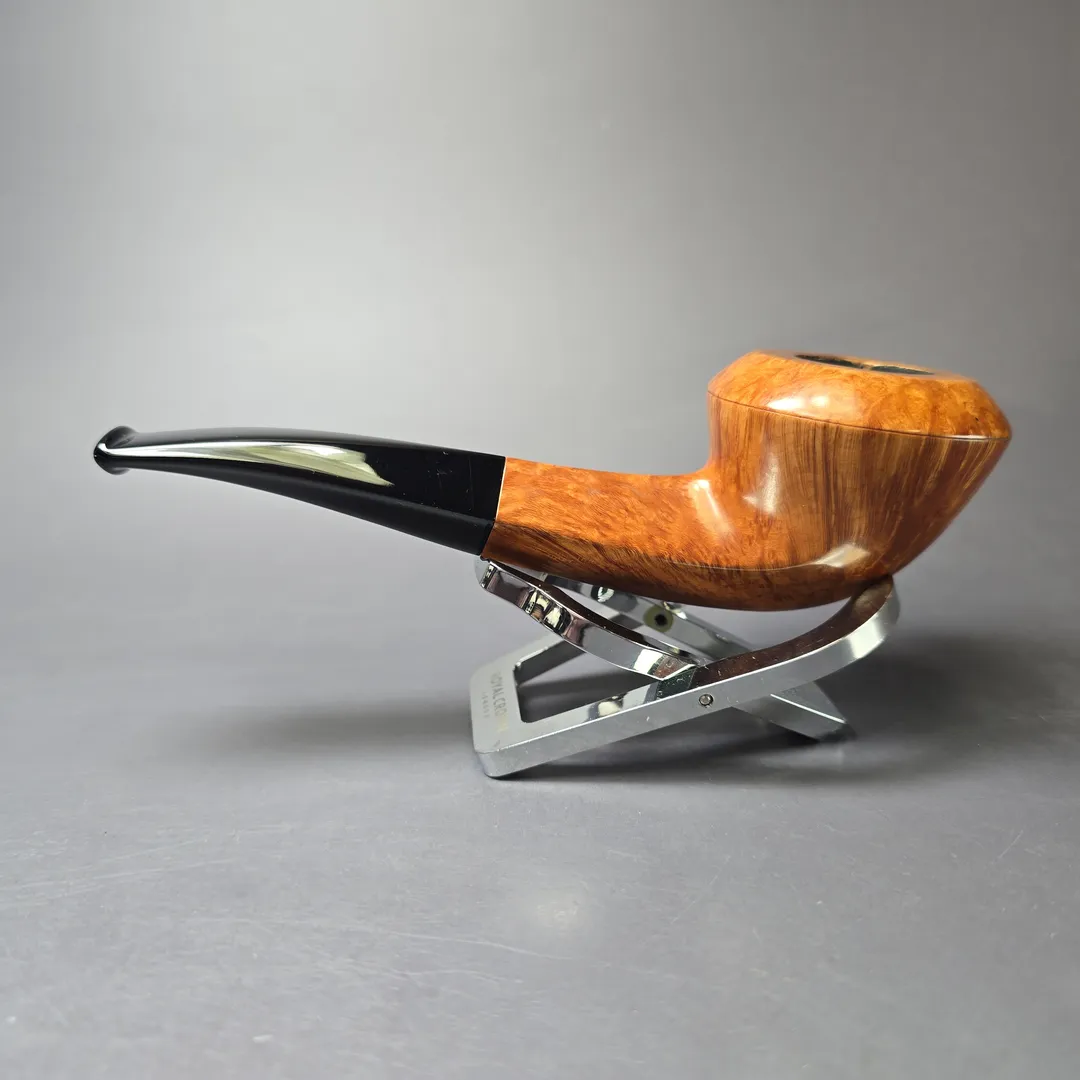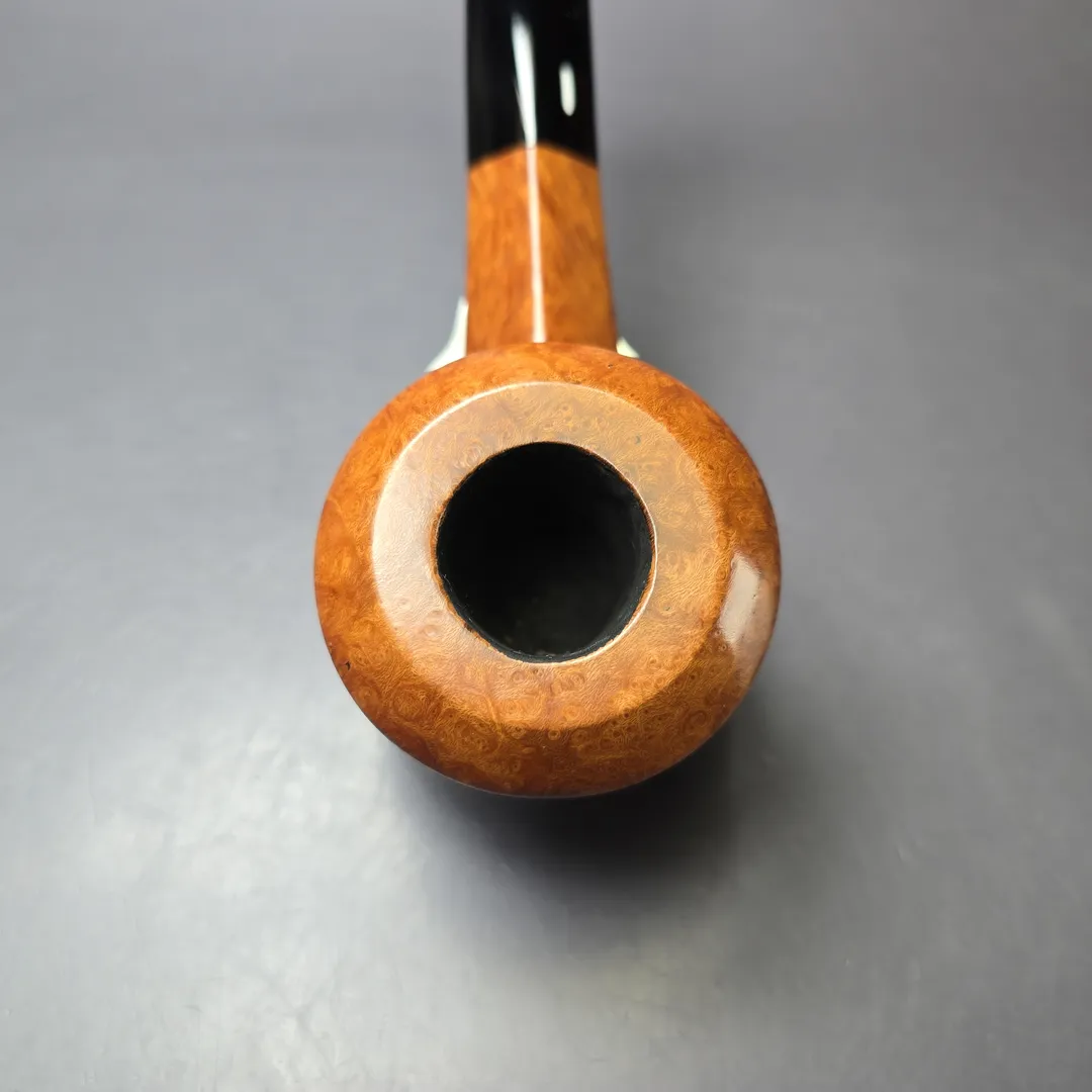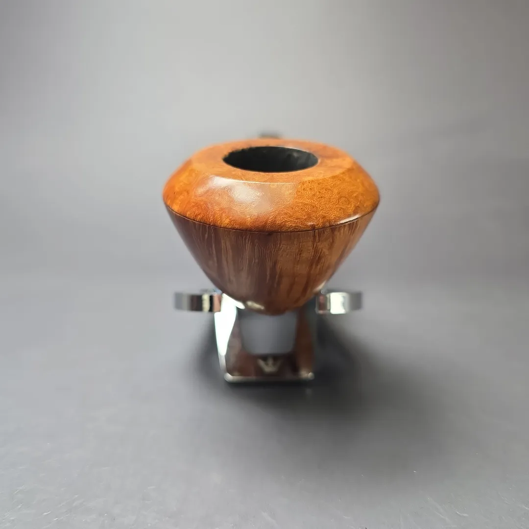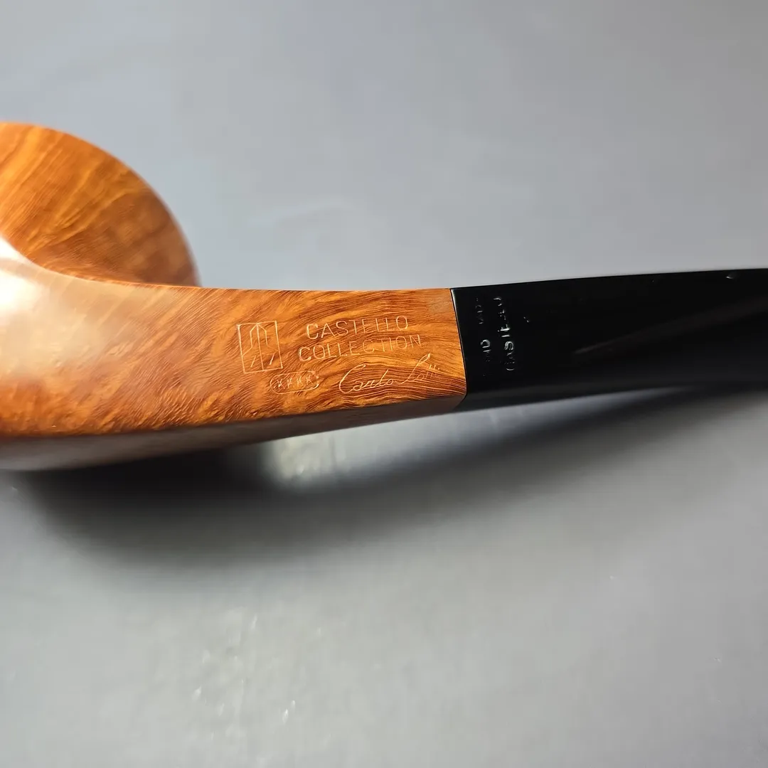Castello’s Collection line sits near the very top of the workshop’s smooth finishes. Aside from the rusticated Natural Vergin line, Collection pipes typically wear Castello’s simplest, lightest staining so as to showcase the superior grain patterns necessary to qualify for such an accolade. Once it has been established that a Castello has attained a Collection grade, these pipes are assigned an additional grade that further differentiates them according to just how good the graining is. Since around 1969, the letter “K” has been used to denote subdivisions within Castello grades, running from one “K” to four “K”s, the latter being the highest possible for standard-sized pipes. That this Castello attained a Collection “KKKK” grade is unsurprising, given the tight striations running around its bowl and the veritable halo of “bird’s-eye” at its rim. What is surprising, on the other hand, is the shape. To put things into context, though shape numbers are not typically included on Castello pipes themselves these days, the workshop still mostly operates according to a shape chart, albeit one with a little more room than most for differing interpretations of those shapes. This one would be a shape 58, an already quite rare one and the workshop’s house bent bulldog design. What’s interesting about this rendition, however, is how uncommonly high the bead-lines dividing the bowl’s upper and lower sections are, making for a very different kind of bulldog, even by Castello’s standards.