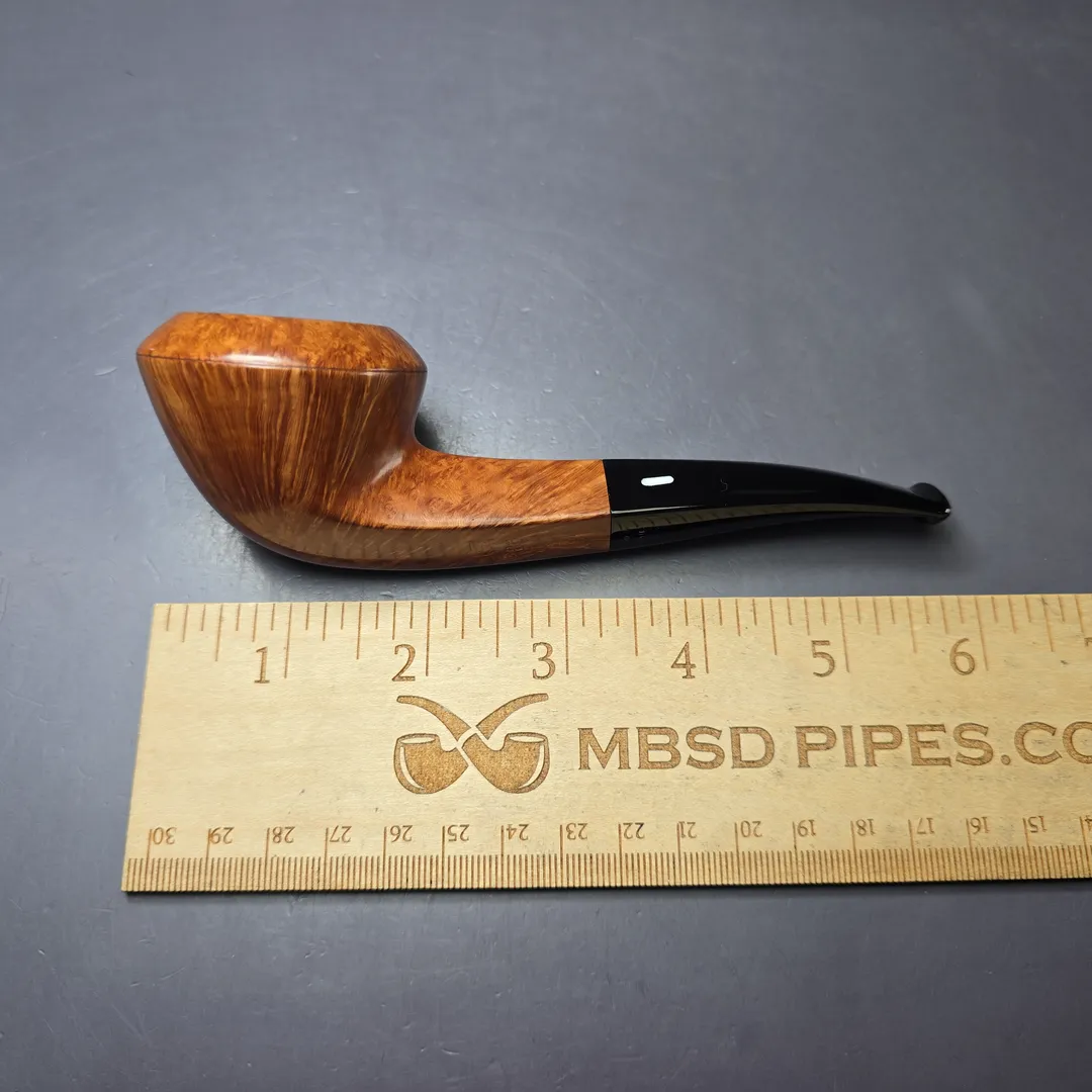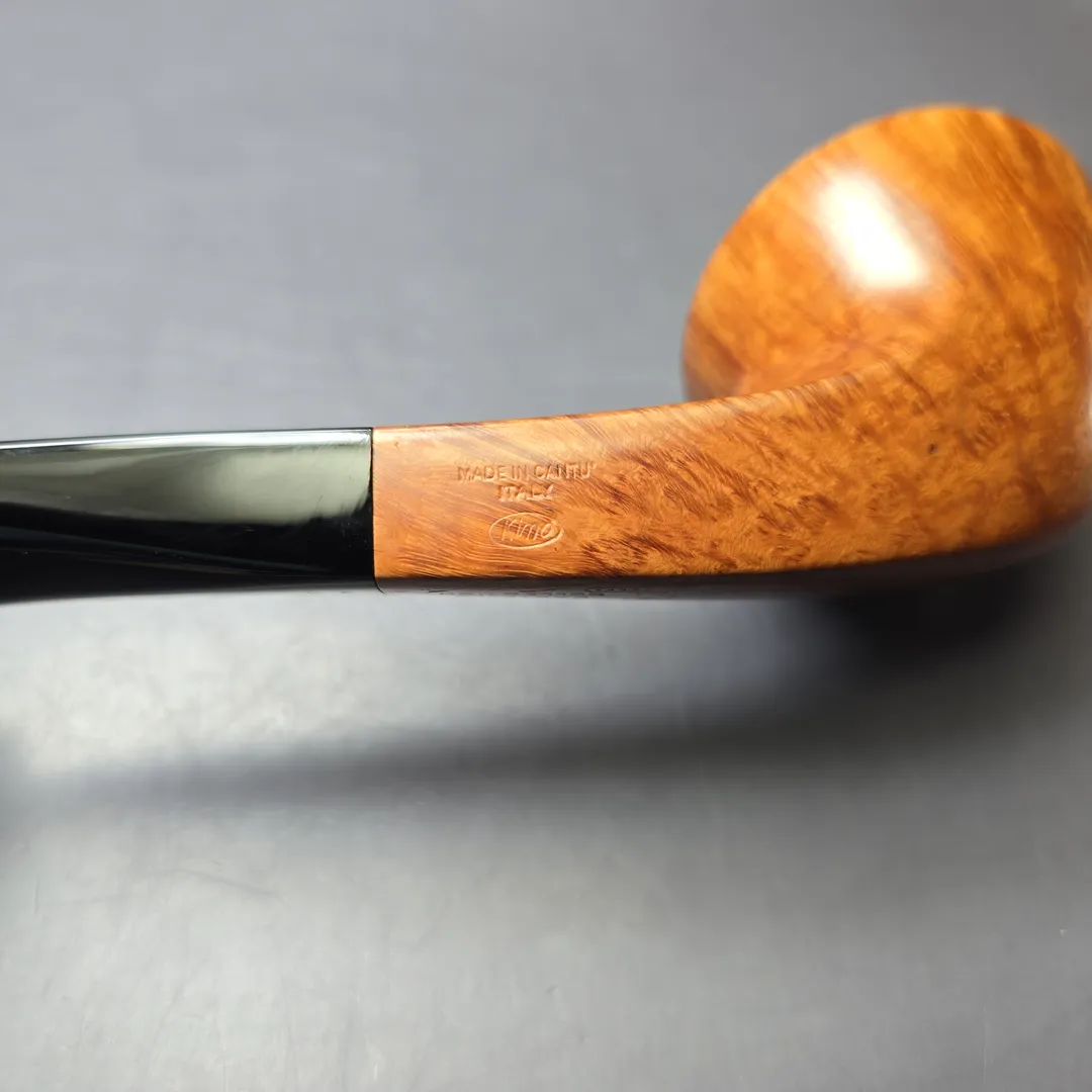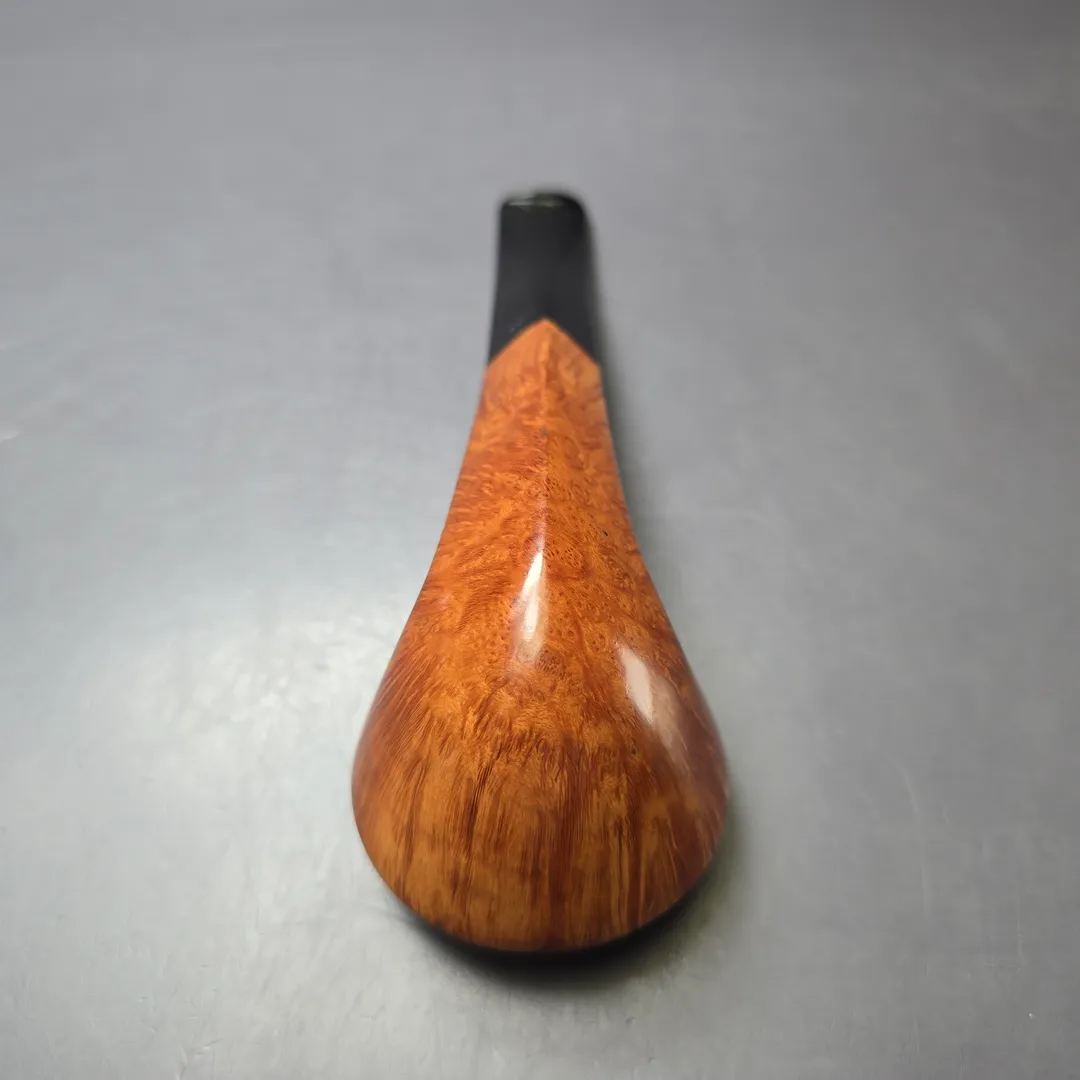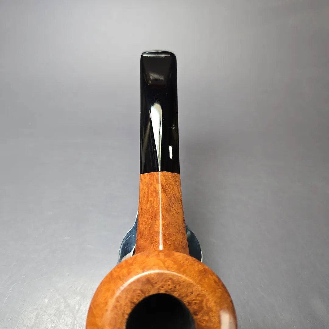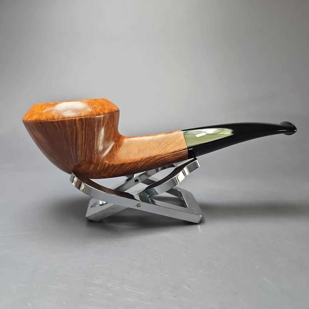 Castello’s Collection line sits near the very top of the workshop’s smooth finishes. Aside from the rusticated Natural Vergin line, Collection pipes typically wear Castello’s simplest, lightest staining so as to showcase the superior grain patterns necessary to qualify for such an accolade. Once it has been established that a Castello has attained a Collection grade, these pipes are assigned an additional grade that further differentiates them according to just how good the graining is. Since around 1969, the letter “K” has been used to denote subdivisions within Castello grades, running from one “K” to four “K”s, the latter being the highest possible for standard-sized pipes. That this Castello attained a Collection “KKKK” grade is unsurprising, given the tight striations running around its bowl and the veritable halo of “bird’s-eye” at its rim. What is surprising, on the other hand, is the shape. To put things into context, though shape numbers are not typically included on Castello pipes themselves these days, the workshop still mostly operates according to a shape chart, albeit one with a little more room than most for differing interpretations of those shapes. This one would be a shape 58, an already quite rare one and the workshop’s house bent bulldog design. What’s interesting about this rendition, however, is how uncommonly high the bead-lines dividing the bowl’s upper and lower sections are, making for a very different kind of bulldog, even by Castello’s standards.