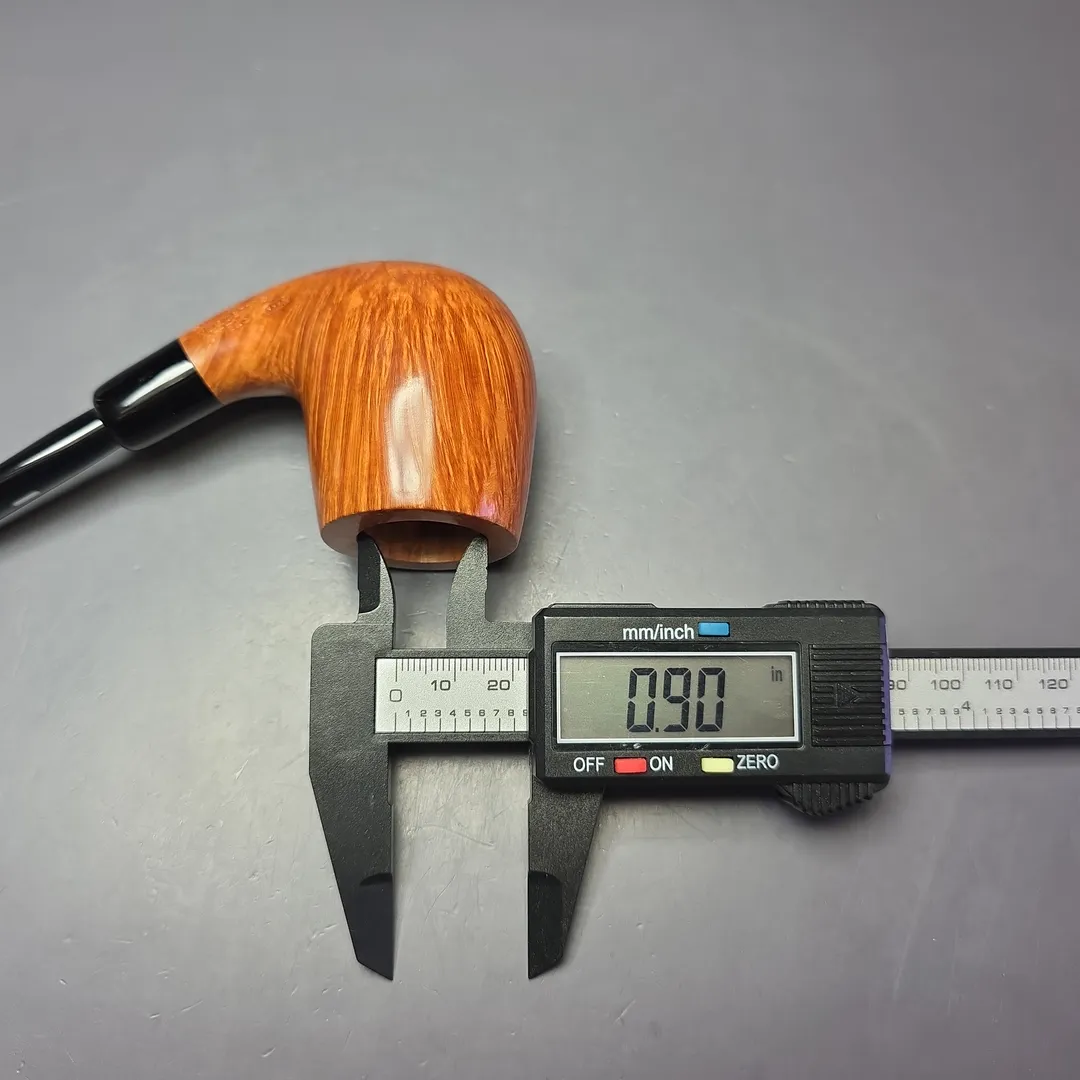 Castello’s Collection line sits near the very top of the workshop’s smooth finishes. Aside from the rusticated Natural Vergin line, Collection pipes typically wear Castello’s simplest, lightest staining so as to showcase the superior grain patterns necessary to qualify for such an accolade. Once it has been established that a Castello has attained a Collection grade, these pipes are assigned an additional grade that further differentiates them according to just how good the graining is. Since around 1969, the letter “K” has been used to denote subdivisions within Castello grades, running from one “K” to four “K”s (uppercase before 1982, lowercase after), the latter being the highest possible for standard-sized pipes. This one, for example, looks to be a quite uncommon example of a Lucite army mount rendition of the workshop’s shape 65 bent billiard, and quite rightly attained a full 4 “k” grade on account of the tight, consistent straight grain running 360 degrees around its bowl.