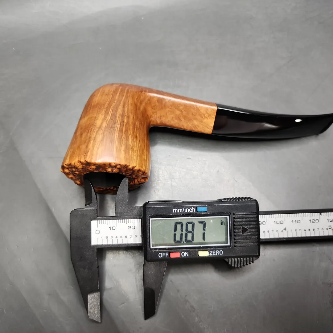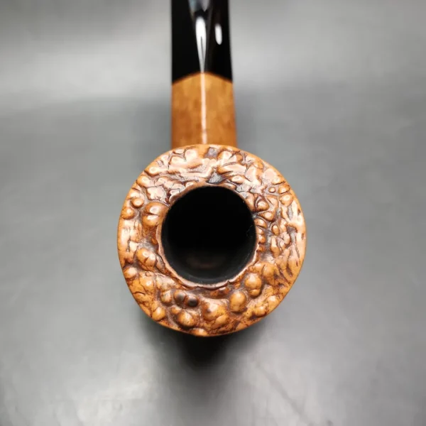 At the end of the 1960s, the Castello workshop began crafting – or, at least, began formally designating – larger than average pipes in their various house finishes, often carved freehand in distinction from their loose shape chart. These pipes were dubbed “Big Line.” In 1972, Castello swapped this designation for “Great Line,” though the design philosophy remained the same (“Big Line” would later be taken up again to mark magnum-sized creations). This freehand Dublin is a Great Line rendition of one of Castello’s highest grade finishes, the Collection. Though not especially long, it is nonetheless a good chunk of beautifully grained briar, with a chamber nearly 5 centimeters deep and a plateau rim rarely found on typical Castello pipes. Judging by the Great Line designation and the lack of a date code stamp, this Castello will have been made at some point between 1972 and 1987, though as the pipe does not appear to have a grade stamp (either the uppercase or lowercase “K” used during this time), I would presume that the pipe is on the older end of that range.