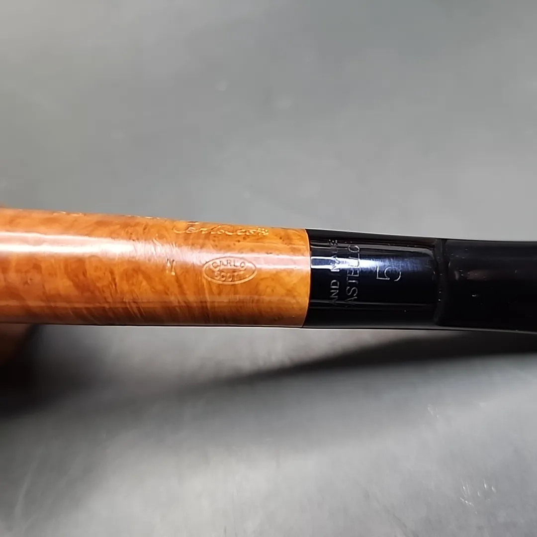 This might just be the nicest smooth finish Castello I’ve ever held. It’s a Collection, so it’s one of Castello’s highest standard grades, but the straight grain patterns are so tight and evenly distributed around its bowl that I’m surprised the stummel didn’t end up as an Aristocratica. As an extra distinction, this Castello includes a bare plateau rim, which I’m normally only used to seeing on Great Line freehands, if on Castello pipes at all. Judging by the shape code in the “castle” stamp, this pipe was made in 1991, while Carlo Scotti was still head of the Castello workshop. It’s a 3 (out of a possible 4) “K” grade Collection, and the “N” stamp indicates that the pipe was originally sold at Milan’s Noli Pipe tobacconist.