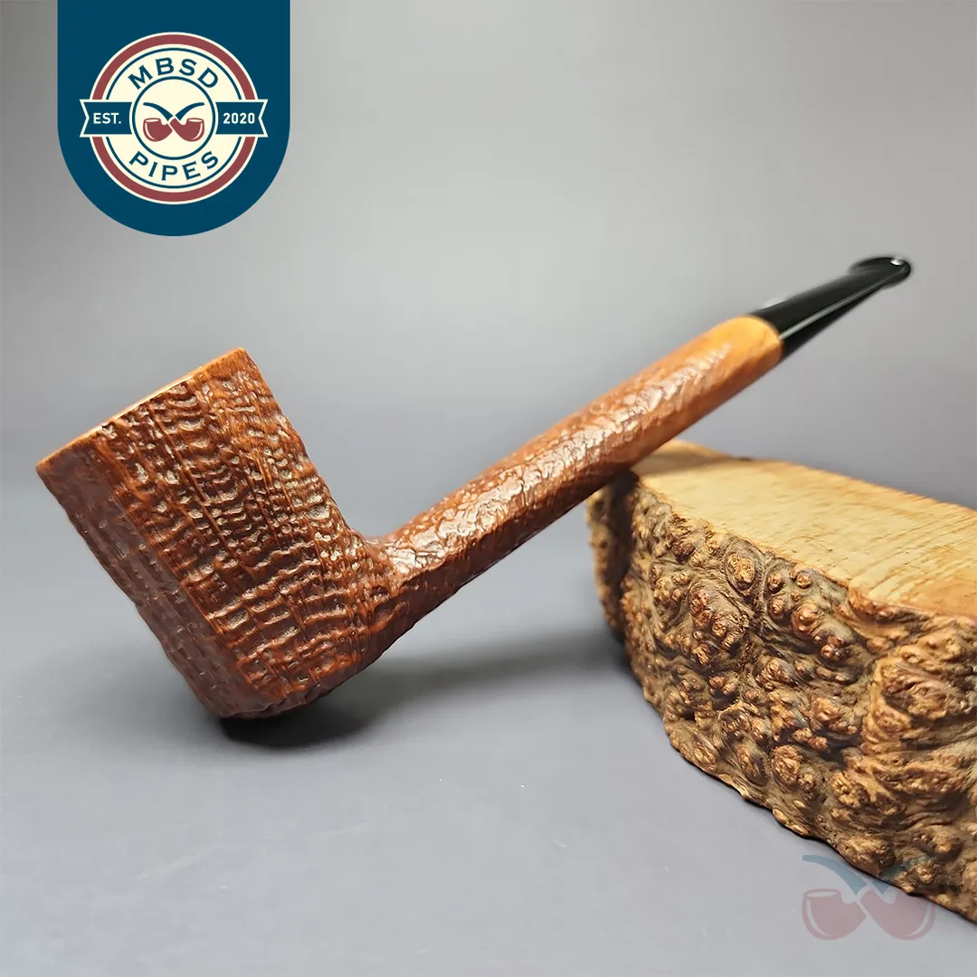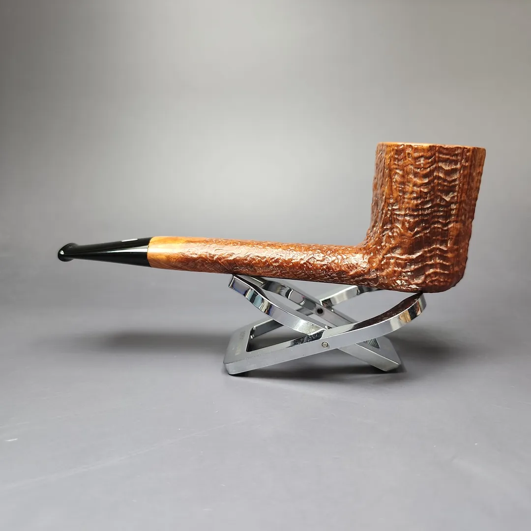 The Old Antiquari is Castello’s flagship sandblast line, typically finished with a warm, reddish tan hue. Such is the case for this particular Castello, which happens to be a stellar example of the workshop’s technique. In a fashion somewhere between the Anglo-American and Italian approaches to sandblasting, the bowl on this Antiquari is both deep and craggy in its texturing, with ring grain prominently circling its bowl, while also giving emphasis to the briar’s vertical lines, expressed as a rugged, “netted” relief. The shaping on this one is quite interesting, too. It’s a group “G” size, used for Castello’s larger pipes, but it also happens to be a rare example of the workshop’s shape “32” Canadian, featuring an octagonal, paneled bowl. The pipe also features Castello’s trademark registration number, gesturing at it being an older make (though when exactly the registration number stamping was discontinued is still debated).