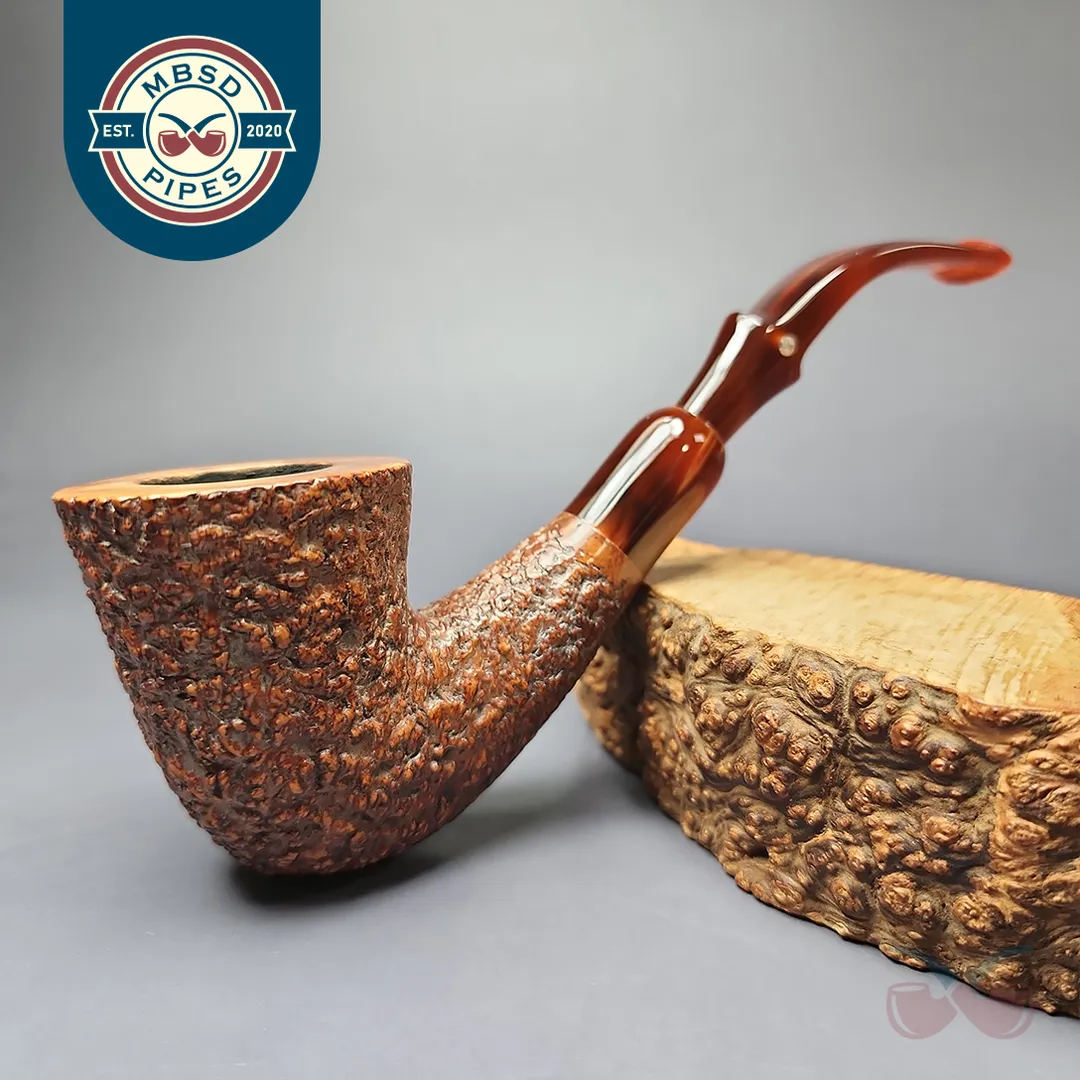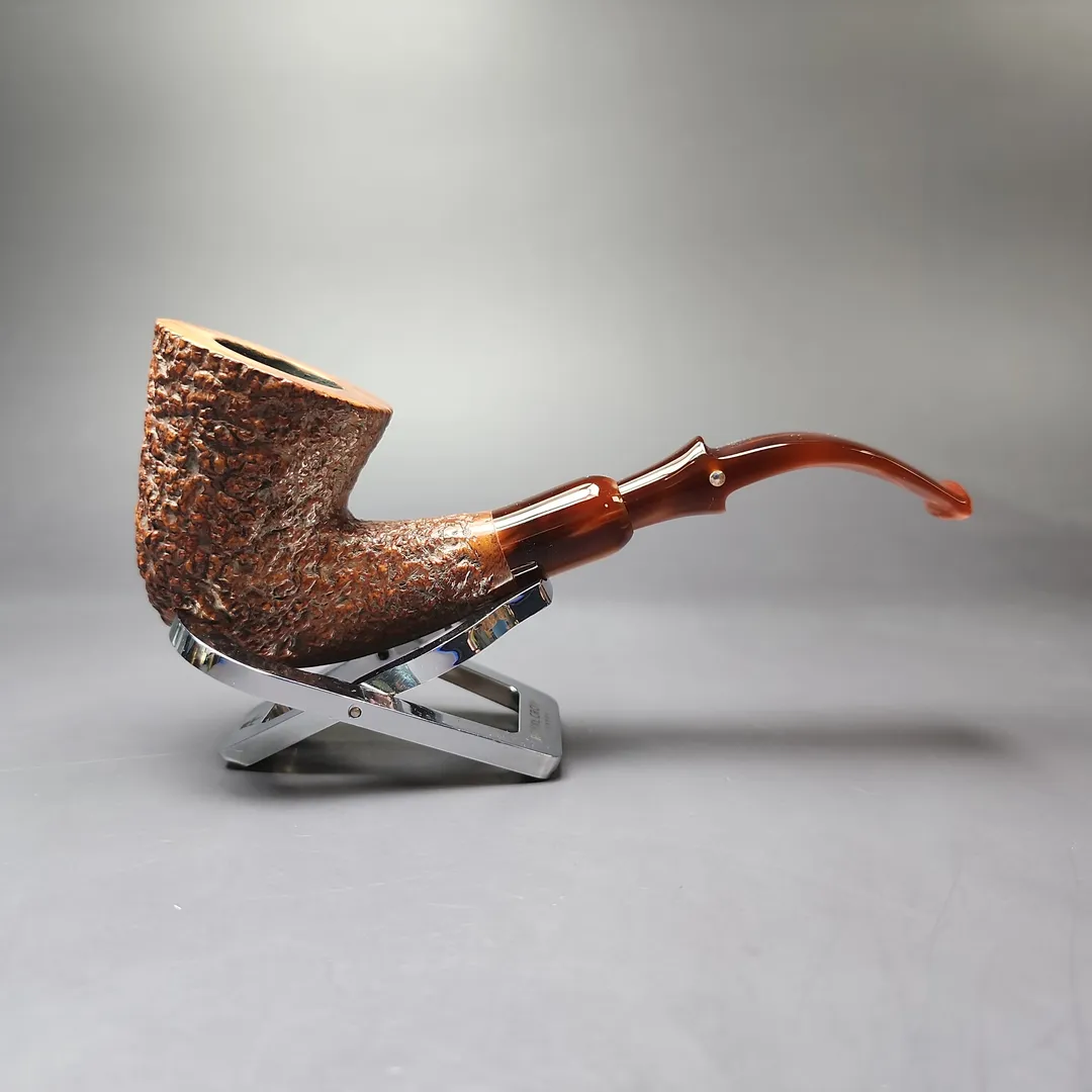 The Castello workshop crafts pipes in a number of finishes, but if there’s one finish that has come to define to define the venerable Italian make, it’s the Sea Rock. It may well be Castello more than anyone else that has proven that rusticated pipes can be as high-grade as their smooth and sandblasted counterparts. This one shows off the particular pebble-dash approach that helped make Castello—and many other Italian brands—what they are today. Based on the “S” stamping and the absence of a “K” or “k” size notation, this would appear to be one of those early pipes, which I’d estimate to have been made around the mid- to late 1960s. More specifically, it looks to be one of the first Castellos imported to America by Wally Frank Ltd., hence the rhinestone stem inlay (Wally Frank already produced a pipe with a logo similar to Castello’s white line inlay), which is where Castello mania properly took off. The pipe itself is a rather unique iteration of the Sea Rock Briar line (and the shape “49” calabash with it), having a lighter, tan finish, as well as an army mount and stem cut from swirling red Lucite.