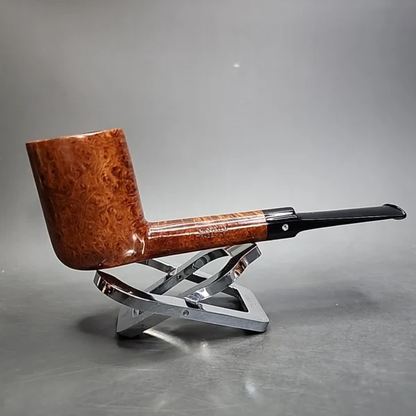 The “75” is Castello’s interpretation of the traditional Lovat shape, though as with all of the workshop’s shapes, their version is quite distinct. It’s somewhere between a stack, a Lovat, a lumberman, and a saddle billiard, and it’s also changed a little over the years. This iteration, from somewhere between the end of the 1960s and the beginning of the 1980s (hence the “K” grading), leans more toward the saddle billiard, albeit with a more formidable length than usual. The pipe’s tall bowl also allows it to show of brilliant bird’s-eye patterns on either side of its bowl, joined by cross-grain at its aft and fore.