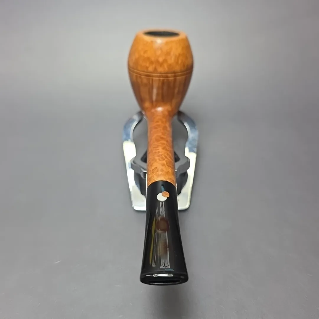 I’ve brought up Claudio Cavicchi’s near-unrivaled versatility many times before. He can turn an Anglo-French large billiard with grain comparable to the highest grades on the Dunhill Dead Root line, an Italian-style Dublin leagues ahead of most of his compatriots, or indeed a Danish horn that one might mistake for the work of Jess Chonowitsch. This one surprised me, though—not in terms of quality, as it is an unsurprisingly masterful work, but in terms of its shaping. After all, the form this one takes is unlike just about anything produced in the artisan scene today, and indeed unlike the pipes produced by factories for the last 100 years or so. Though it bears some of the hallmarks of the Rhodesian, its tall, tulip-like bowl and lengthy shank bring it closer to the “Belge” and “Belgian” designs that originated in clay pipes centuries ago. These designs were often transposed into the medium of briar at the latter’s outset, and notable examples can be found in old Kaywoodie and Charatan catalogs, but it’s by no means a common shape today. Cavicchi’s study is quite fascinating and, as already mentioned, masterfully executed. The transition from straight grain to birds-eye right around a bowl’s bead-lines, for example, is always impressive to see someone pull off, as is the case here.
