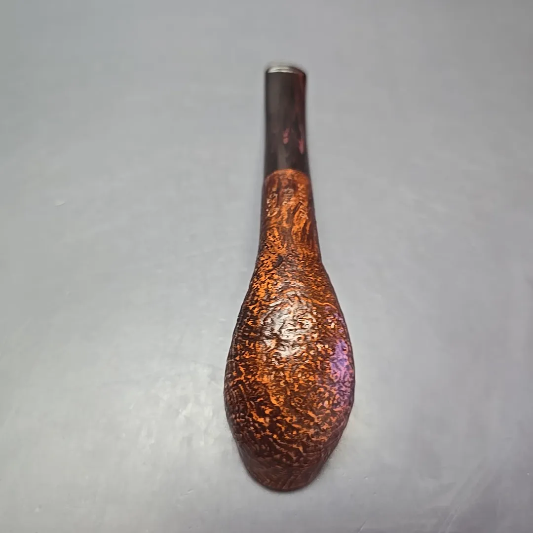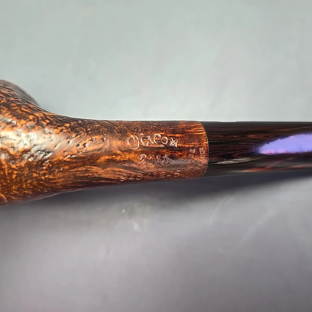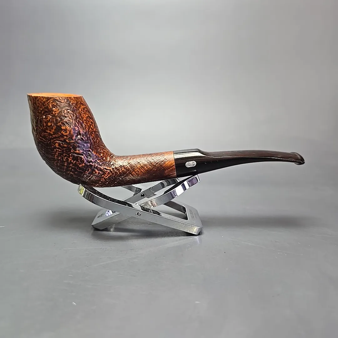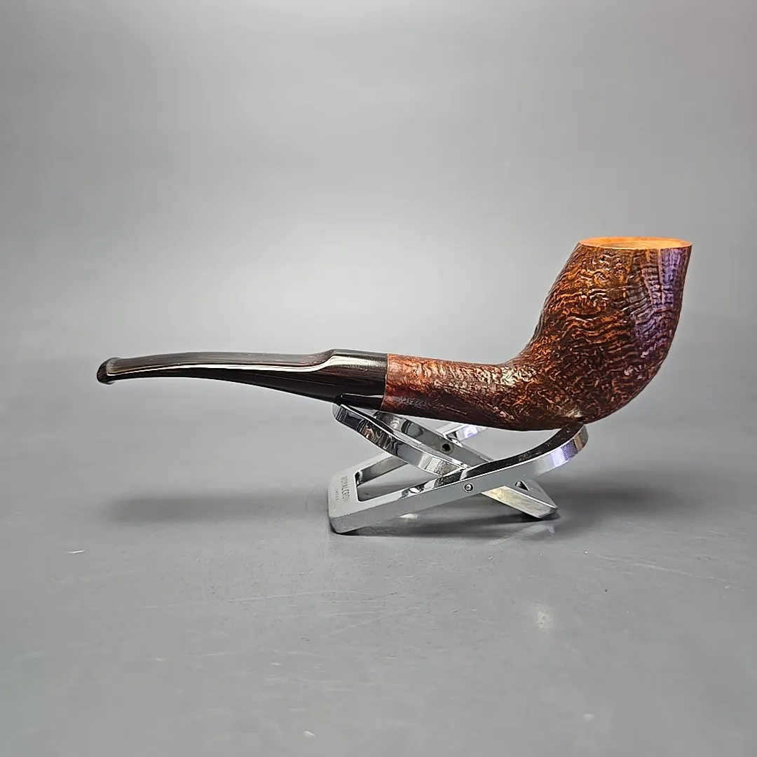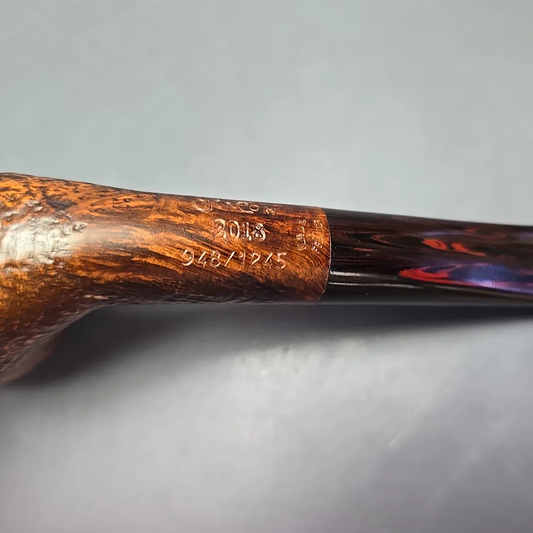 Since 1978, Chacom has released its own, special “Pipe of the Year,” with each annual release being a unique design limited to no more than 1245 pieces. Sometimes these pipes are designed for Chacom by close friends and collaborators of the company, such as Pierre Morel, and sometimes the designs are done in-house by Chacom’s resident maîtres-pipiers. The 2018 model, seen here, was an example of the latter, conceived by Chacom’s current director, Antoine Grenard. Grenard is credited with revitalizing Chacom pipes in the 2000s, helping to expand the company’s roster of shapes and finishes and provide something of a modern touch to the historic make. In the case of the 2018 Pipe of the Year, Grenard created this beautifully supple, egg-cutty hybrid, evoking both early French briars and the pioneering artisans of post-war Denmark. As an extra contemporary touch, each 2018 model—this being the sandblasted variant—was fitted with a hand-cut cumberland mouthpiece, rather than the standard vulcanite and black acrylic Chacom typically employs.