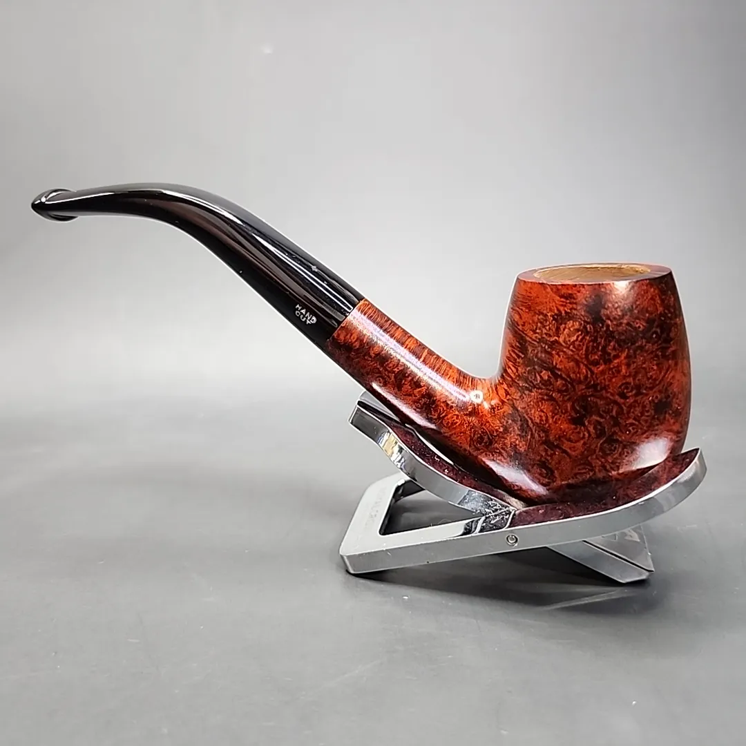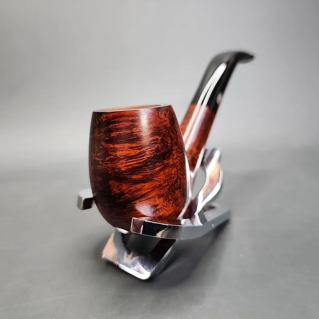 Here’s an interesting pipe: a Chacom Centenaire. ‘Centenaire’ is French for ‘centenary,’ i.e., a celebration marking 100 years of something. Funny thing is, this isn’t one of the Centenaire pipes released recently by Chacom, which marked 100 years of the Chapuis-Comoy partnership. So, what did it commemorate? Perhaps there was another date worthy of celebration. In any case, it’s a lovely pipe. Eminently traditional and elegant in its simplicity, it is a bent billiard worthy of standing with the best of them. The contrast red staining on the bowl highlights the bird’s-eye and cross grain quite wonderfully.