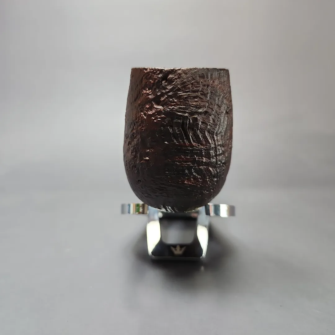 Named for the tree from which briar is harvested (Erica arborea) Chacom’s Erica line is one which, in the company’s own words, ” combines elegance and practicality.” Bringing together deep chambers well suited for long, contemplative smokes, with reserved finishes, one might call it the most devoted of Chacom’s line to the harmony of form and function. This one wears the Erica line’s sandblast finish, dressed in a dark burgundy, slight contrast stain that’s offset by two rings of polished briar inlaid in the pipe’s acrylic stem.