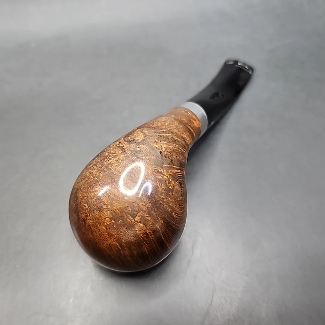 I have a real fondness for Chacom’s Golden Grain. It’s a long-discontinued line, and the kind of high-grade pipe that Chacom charges hundreds of euros for these days. The staining is just wonderful, appearing to be a contrast stain of blonde and black that shines in such a curious way. The shape of this one is a very traditional Rhodesian with a silver collar, completed by a simple black stem.