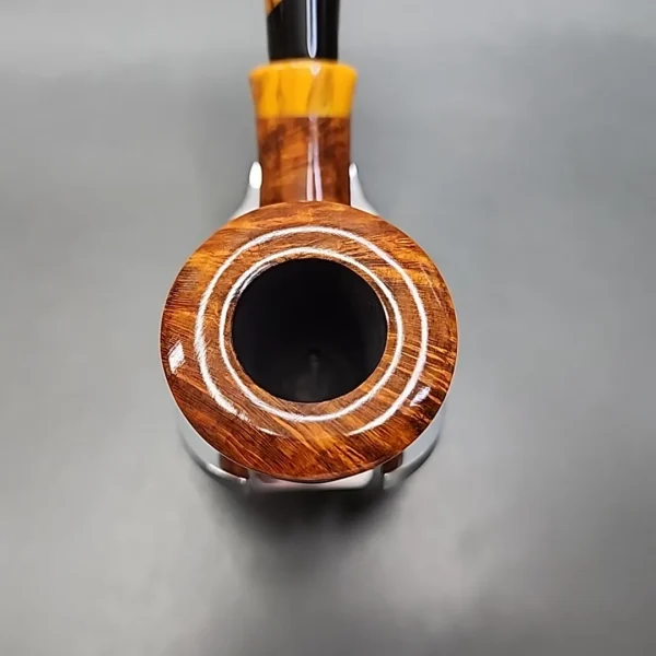 The Richmond is a beautiful, though sadly discontinued, series, and one that seems to sell almost as quickly as I can put them on our website. I could have sworn that we’d sold the last one already, but I suppose there was one left after all. It is no less beautiful than the others, being covered in chatoyant bird’s-eye grain and adorned with an amber-like ferrule and stem band.