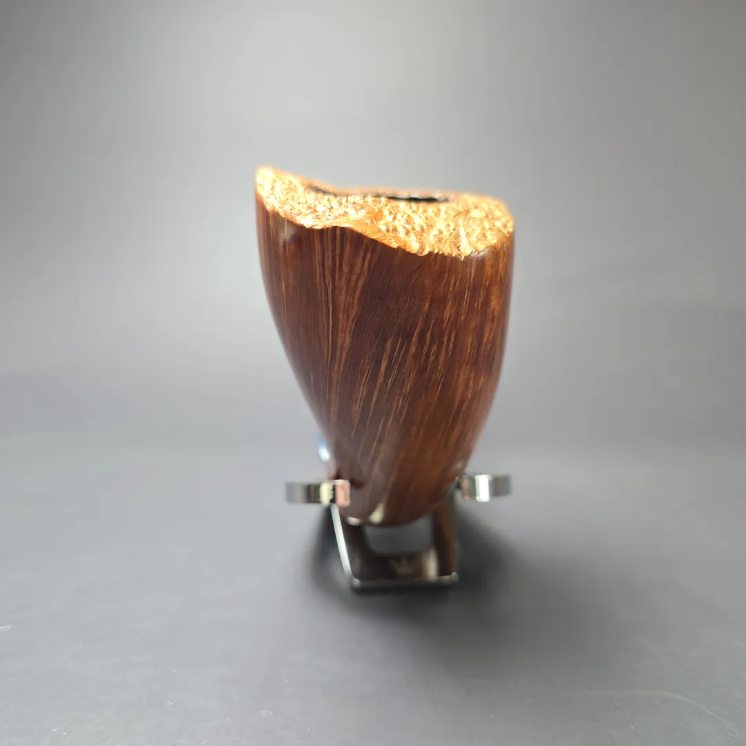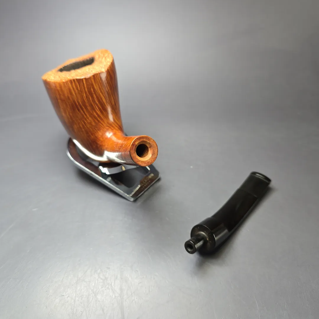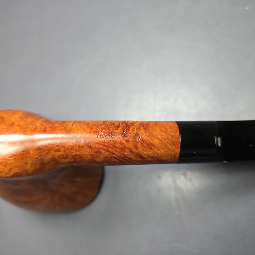 While pipe makers the world over today extol the virtues of a “straight grain” pipe, the idea that such a patterning of the briar is something special, prestigious, and valuable is not as old as one might think. While briar pipes have been manufactured for approximately two centuries, it is only in the last 100 years or so that widespread regard for straight grain in that manufacture would emerge. And a significant contributor to the latter were the pipes of F. Charatan & Son. More specifically, Reuben Charatan, the second-generation owner and manager of the Charatan family firm was a very vocal proponent of straight grain pipes as aesthetically and practically superior to others, and indeed was so strict about the standard to which a properly “straight grain” pipe must adhere that, for most of his time at Charatan’s helm, only he was permitted to turn the bowls for its straight grain pipes. In the late 1950s, this would begin to change, with the creation of the Charatan freehand workshop, staffed by Reuben’s protégés; in the early 1960s, after Reuben’s passing and the acquisition of F. Charatan & Son by Herman Lane, with the freehand workshop taking the “straight grain pipe” to heights even Reuben could not have conceived of. This particular pipe comes from that latter period, being an example of one of its straight grain grades, the Executive Extra Large. True to its grading, it is indeed a quite spectacular, fanning specimen of briar root’s natural, flaring, vertical patterning, and it is most certainly a big pipe, coming in at nearly 8 inches in length and close to 4 in bowl height. The dating of 1961-65 is based on the “MADE BY HAND” nomenclature and proprietary Double Comfort stem. Though the pipe lacks the Lane Ltd. “L” trademark of this first Lane era, such an absence is not uncommon, while the “MADE BY HAND” stamp is typical of hand-turned Charatan pipes made between 1958 and 1965 and not found on pipes made after (when “MADE BY HAND/Made by Hand | In | City of London” became standard instead).