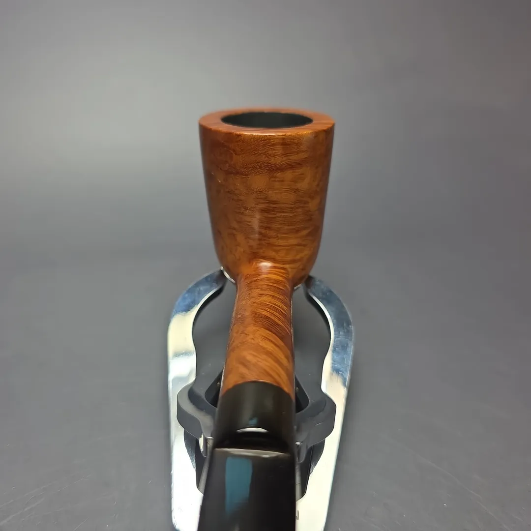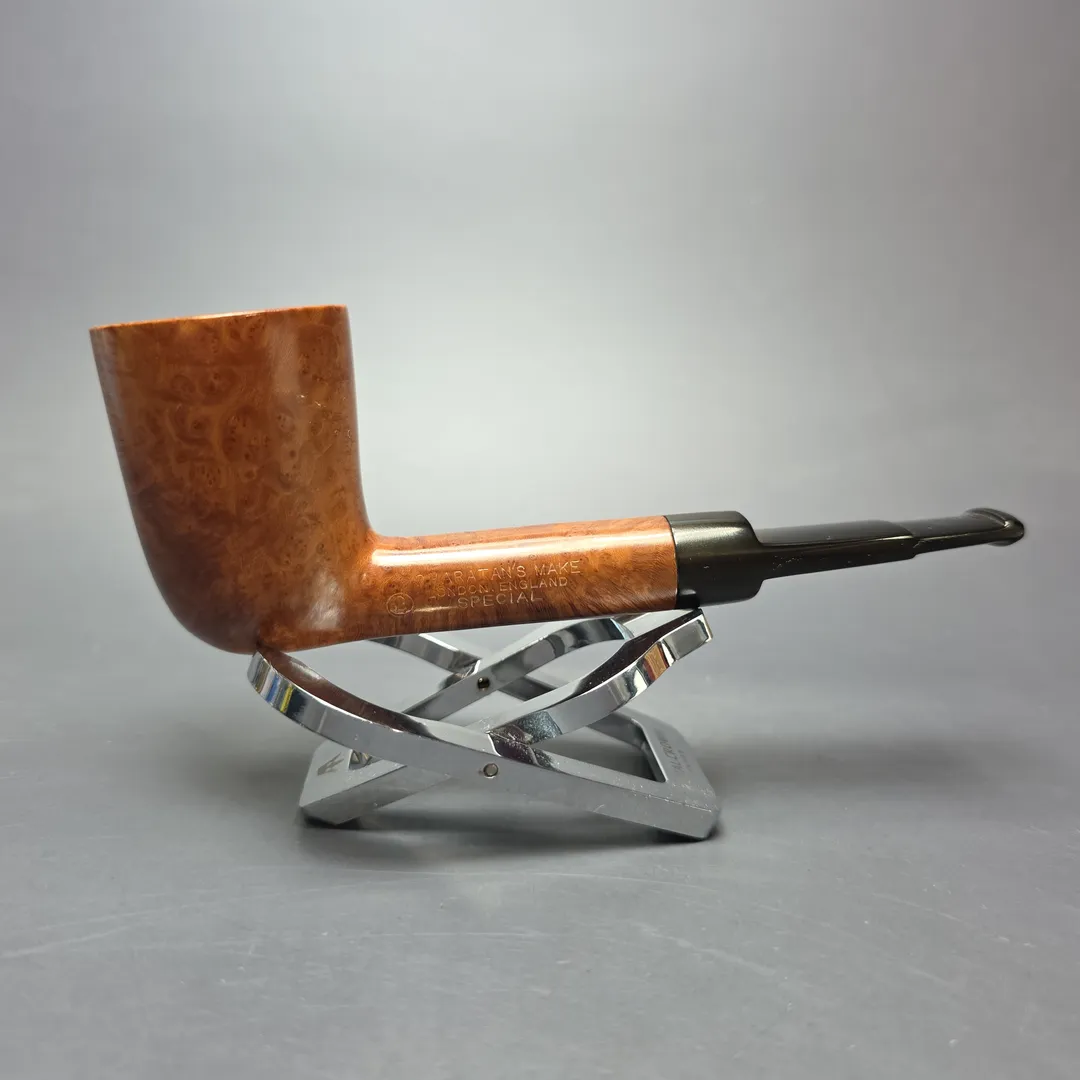 While Charatan remains famous for its straight grain pipes, there was still a place within the make’s grading schemes for other kinds of beautiful briar patterns. The Special was one such grade, which boasted “Perfection in graining in a natural finish” and, more specifically, “Premier quality pipes, cut in ‘cross grain’ or ‘bird’s eye’ graining.” This particular pipe is an example of the latter. A slightly stubby, group 2 rendition of the “Medium Small Dublin” shape created during the Reuben era (during which the Special was first introduced), this one happens to have come from the legendary Lane era that followed after Reuben’s passing. It is a gorgeous pipe, with bird’s-eye grain of a caliber that genuinely deserves the praise heaped on it by Lane’s characteristically bold marketing.
