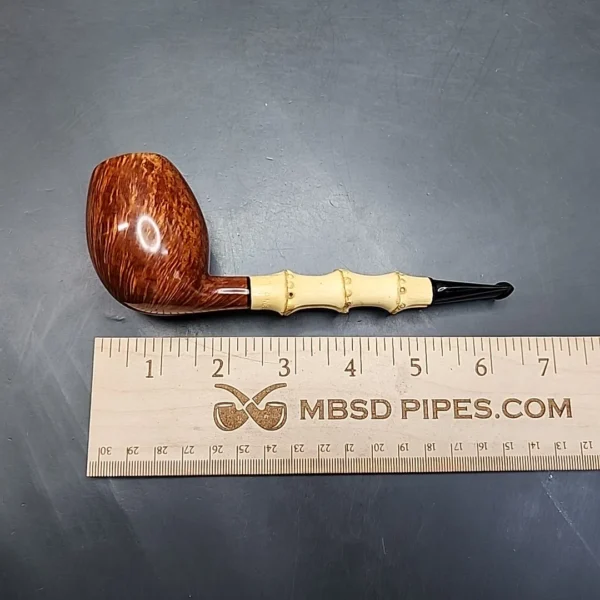 This is the latest of Dave’s own pipes to have arrived at MBSD, and it’s a real looker. I’m actually a little reminded of the Tsuge Ikebana bamboo pipes, as this one combines a slim, three-knuckle bamboo shank with a distinctly round, egg-shaped bowl, and because the bowl is alive with the most beautiful flame grain. As with many of Dave’s pipes, the rim is sloped, which fits in really well with the overall organic quality of the pipe.