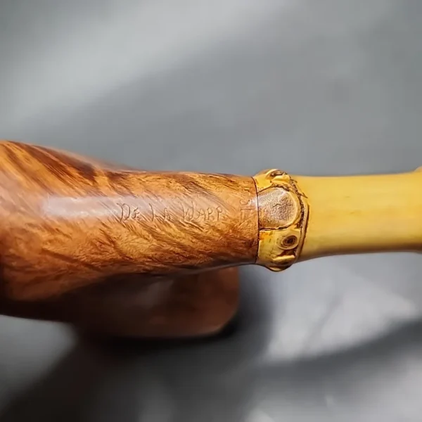I always feel a pang of shame when I can’t identify a pipe. This is especially the case when the pipe is as nice as this one. If I had to guess, I’d guess it was made by an American artisan, probably in the second half of the 20th century when the great American freehand carvers, like Tim West and Randy Wiley, came to prominence. The pipe itself is an extraordinarily large freehand, with excellent shaping that allows the briar’s natural straight grain to fully express itself, along with a bamboo shank extension. If you happen to know who this De La Warr was, please let me know.