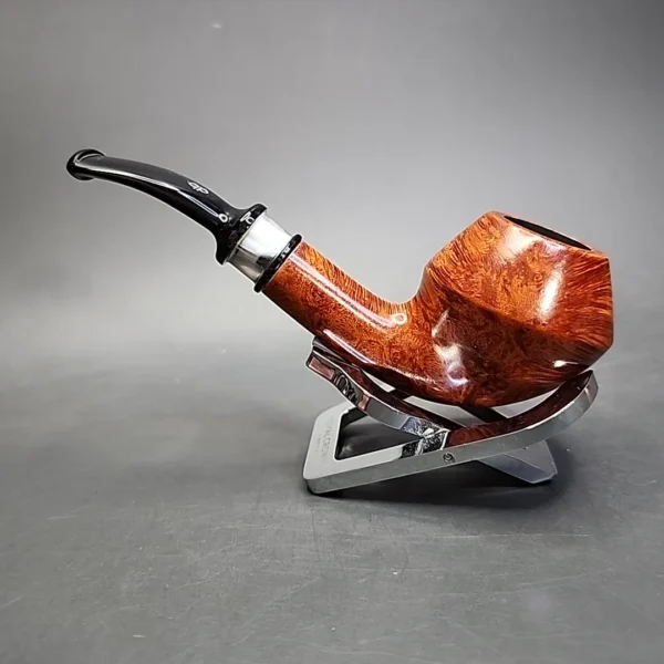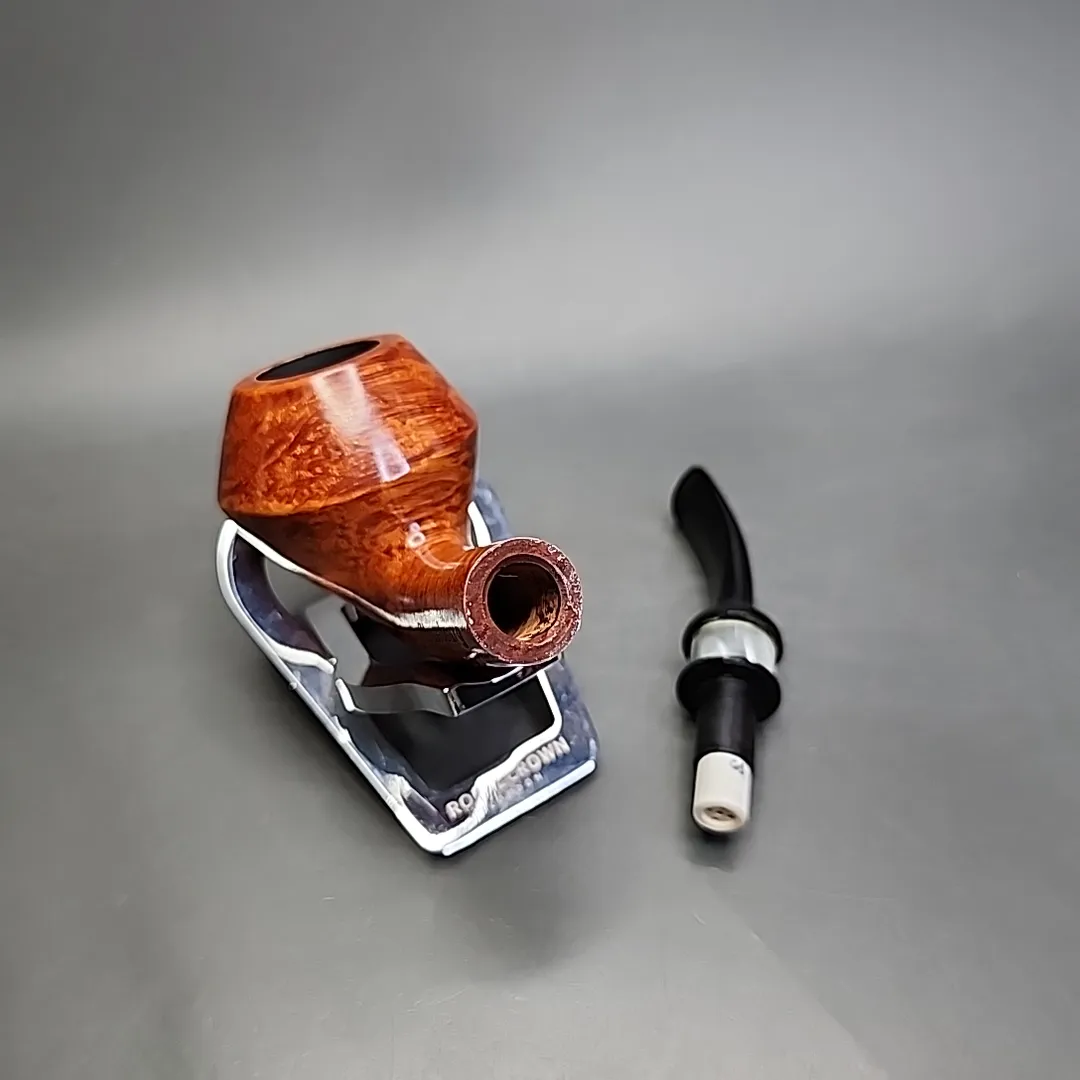 This particular Design Berlin comes from the Strassbourg series, a limited edition series from several years back. As can be seen here, the series combined a light brown, almost strawberry blonde, finish with a smoky acrylic accent and a black acrylic stem. This one is a mixture of design elements from the Rhodesian and horn shapes, in a way reminiscent of some of Stanwell’s pipes (particularly those of Jess Chonowitsch). As a Design Berlin pipe, the stem features a twin bore system, much like Radice and Comoy’s have done at one point or another.