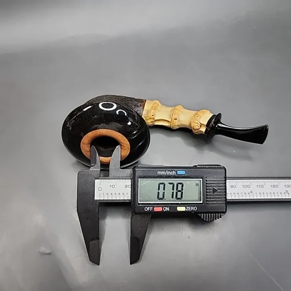 There are so many interesting things about this pipe that I’m not sure where to start. For one, it’s a true calabash – i.e., with a removable cap – but it isn’t made out of meerschaum and gourd, as with the most traditional of calabashes. It isn’t made out of tree heather briar, either, which wooden pipes tend to be. So, what’s it made out of? Well, the bowl and chamber are strawberry wood, which behaves a lot like tree heather, but is more responsive to sandblasting and rustication, resulting in an eminently craggy finish. The shank is bamboo, which allows for a more drastic bend to the pipe’s general curvature. And the cap? That’s polymerized horn, taken from the fossilized remains of a Pleistocene woolly rhinocerous. In other words, it’s around 15,000-year-old ivory, preserved by nature, then made even flashier by complex science that I won’t even try to explain. Oh, and the stem is ebonite.