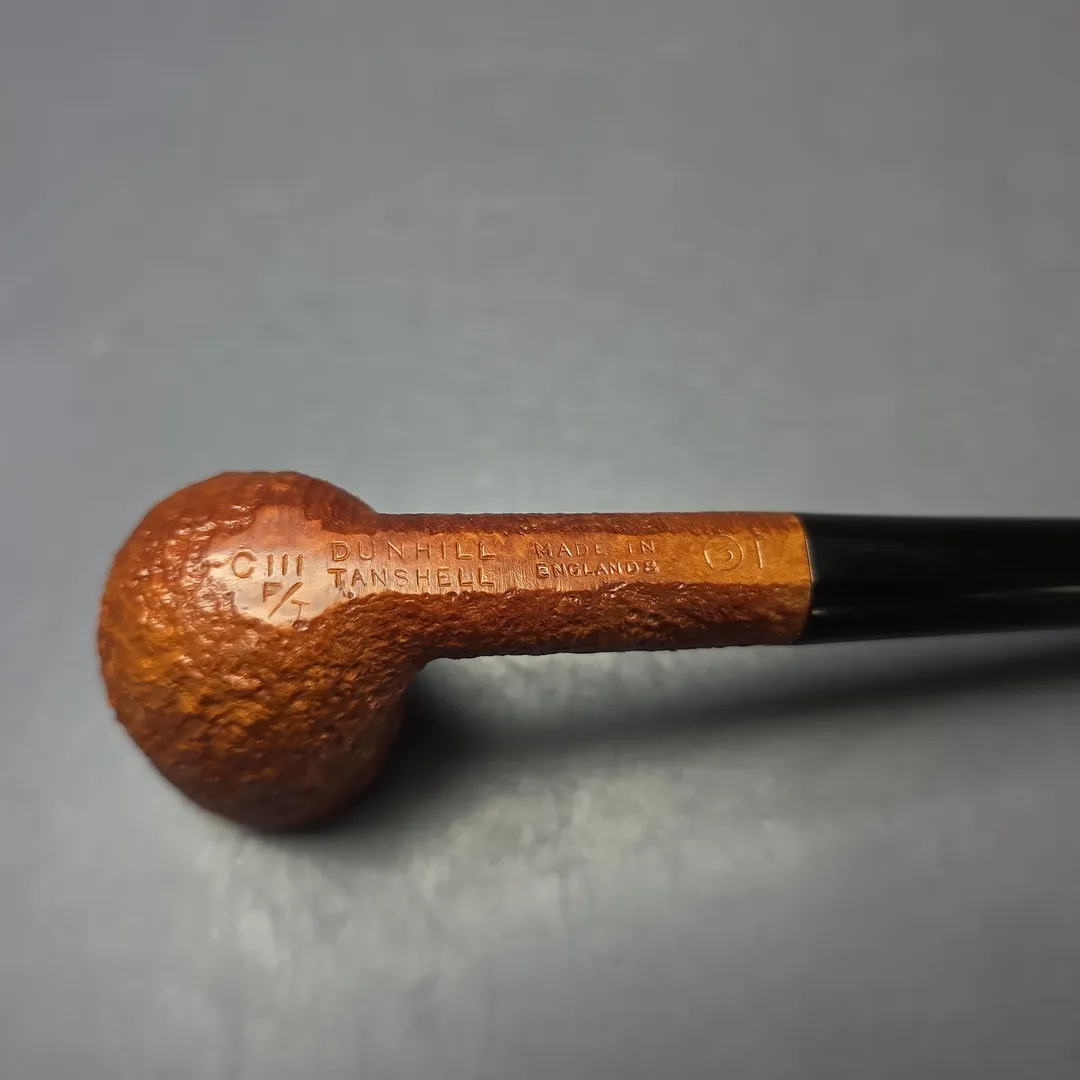 Though Alfred Dunhill Ltd. has manufactured churchwarden shapes since at least the 1920s, they remain some of the rarest Dunhill pipes one can find (or not find, as is more often the case), whether new or estate. The forms these churchwardens have taken have differed depending on the era, in part because they have typically been modified renditions of other catalog shapes, which have themselves changed periodically throughout the last century. This one, for example, is a churchwarden-length rendition of a shape “111,” which would ordinarily be a classic, Anglo-French billiard of a group 3 size. But, as the additional “C” stamp before the shape code on this one indicates, its stummel was destined for greater things (as a side note, “C” has also, at times, been used to designate “Complimentary” pipes gifted by Alfred Dunhill Ltd. to business partners, though in those cases the “C” stamp is larger and positioned differently in relation to other nomenclature). In fact, the stummel used for this pipe was destined for very great things, being not only a churchwarden, but a Tanshell churchwarden, made from dense, Sardinian briar and lightly finished to fully showcase that superior briar and its hallmark rugged relief.