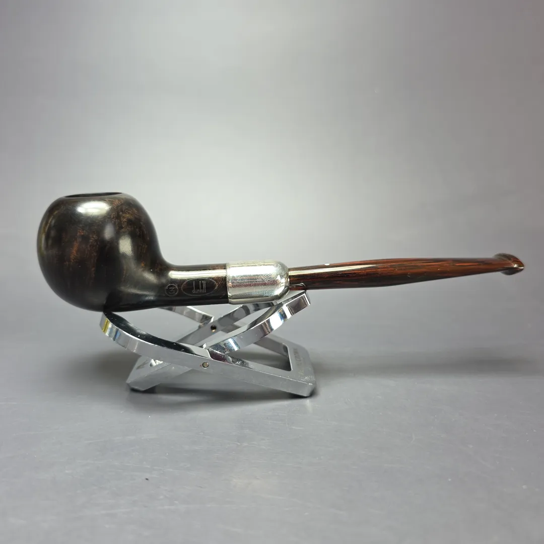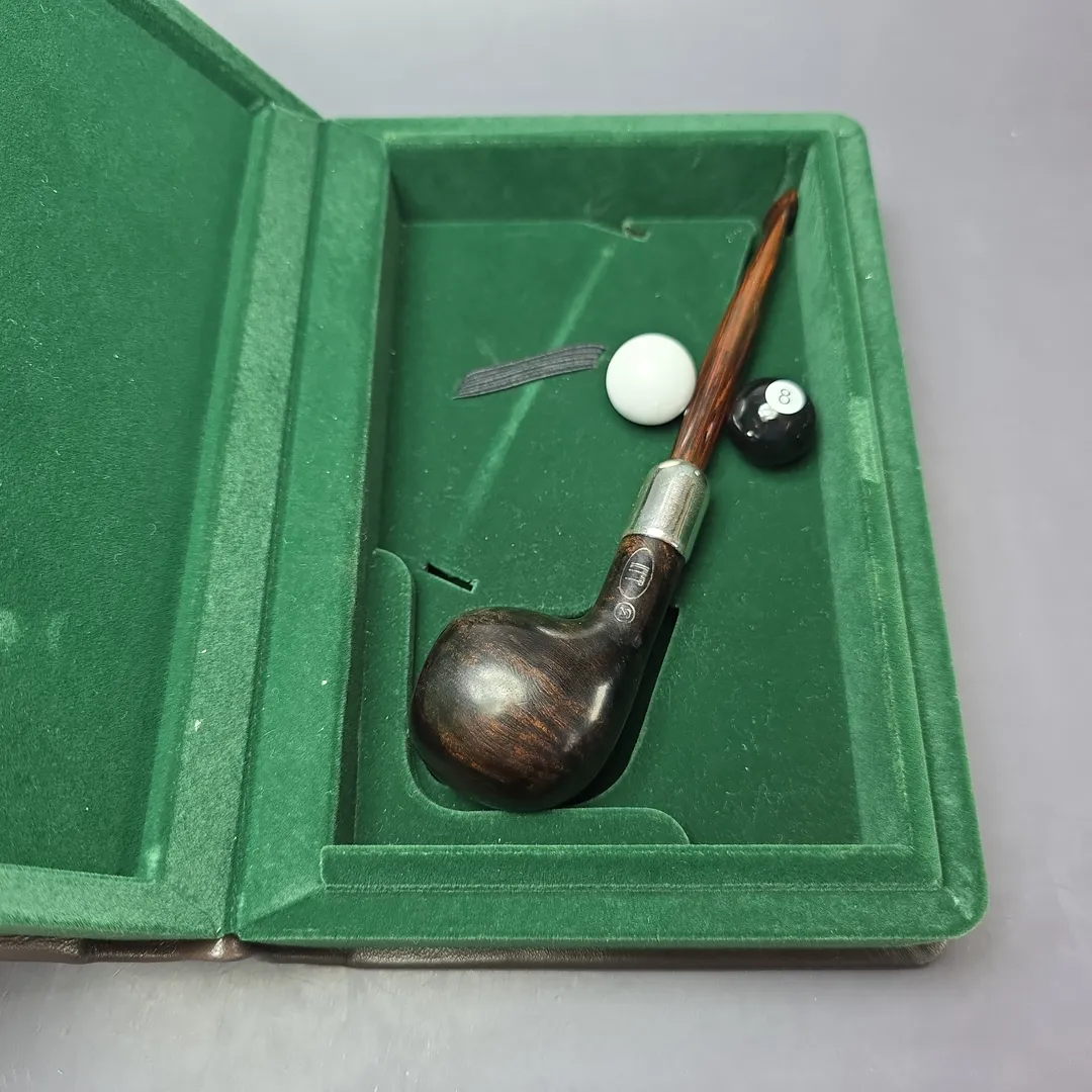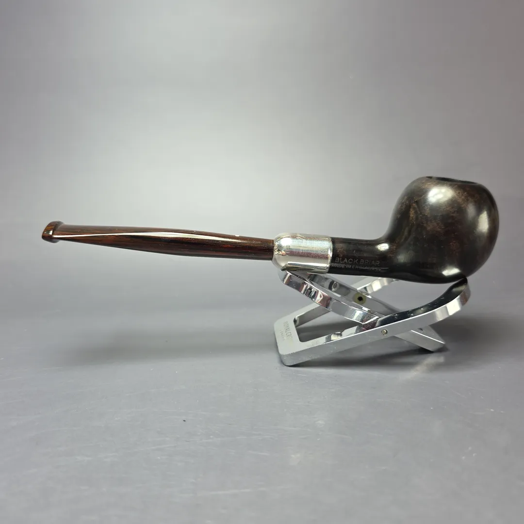 The Black Briar is a rare and all but discontinued line from Dunhill, having among the shortest continuous production periods in the company’s history. Debuting in 1973 and being essentially replaced (more on that in a moment) in 1979, by the silver-collared Dress, the Black Briar is distinguished by its dark, smooth finish and is frequently found with an adornment of some variety to offset the hues of the bowl and mouthpiece. It has, however, been produced sporadically in more recent decades, often in the form of limited edition pipes, such as the commemorative Charlie Chaplin series, or the Dalmatian. This particular Black Briar is another such limited release, known as the “Eight Ball.” Released in 2009 and limited to just 200 pipes in total (100 in Dunhill’s Shell Briar finish and 100 more in the Black Briar), the Eight Ball celebrated the cue sports that have been popular in Europe for over half a millennium, including the games of billiards, pool, and snooker enjoyed across cultures and classes today. Rather than a billiard shape, each pipe was designed to resemble the final, black ball typically pocketed in a modern cue game, also known as an eight ball, as well as the player’s wooden cue, here represented by a cumberland mouthpiece.