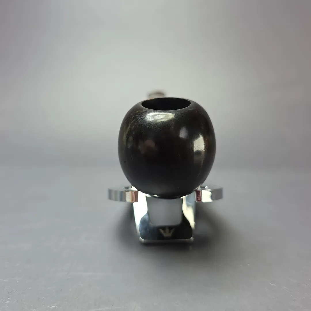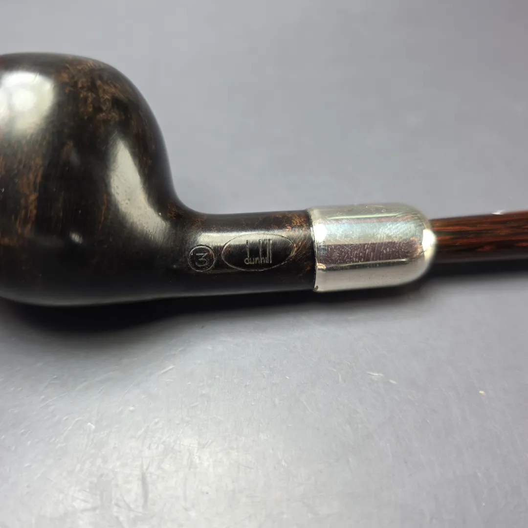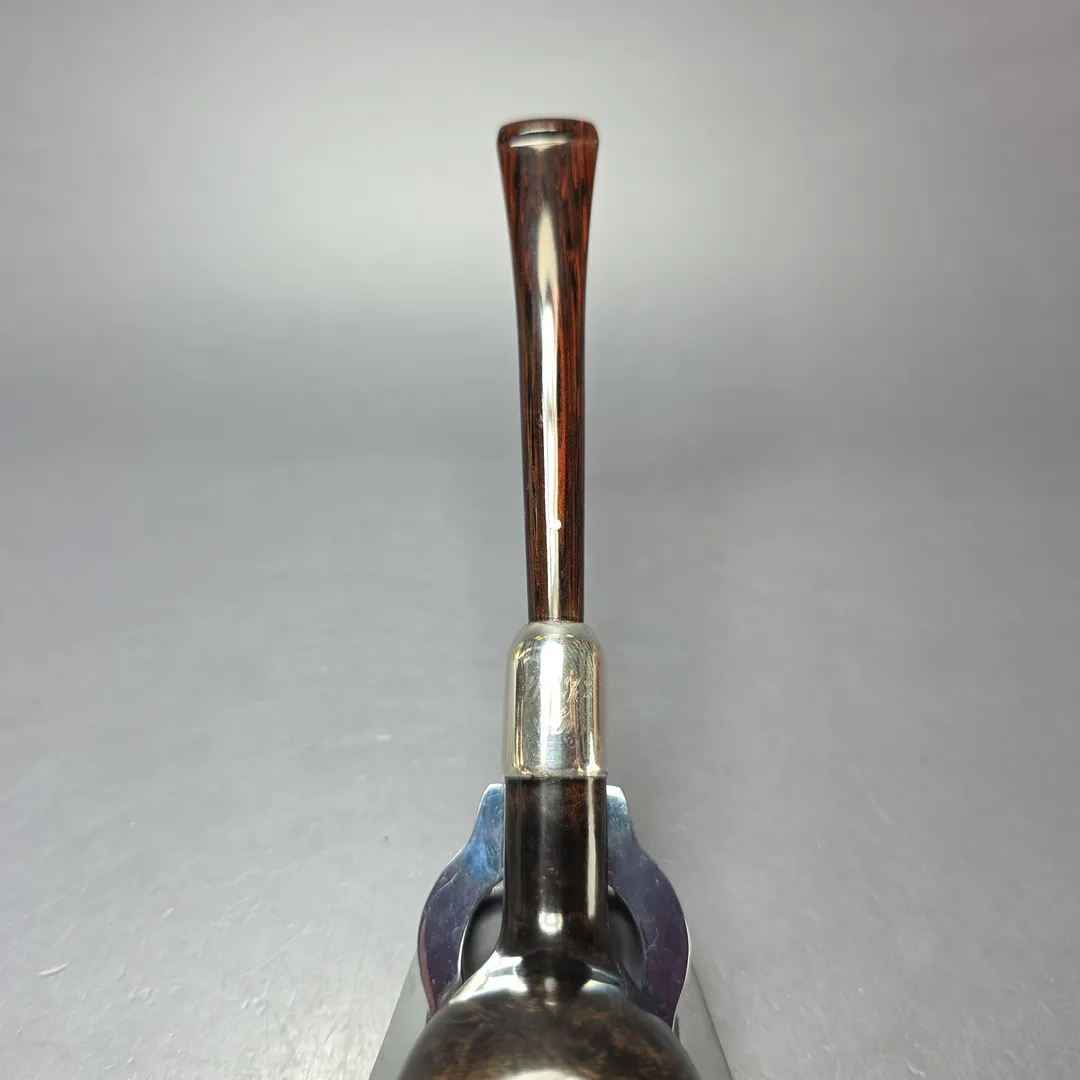 The Black Briar is a rare and all but discontinued line from Dunhill, having among the shortest continuous production periods in the company’s history. Debuting in 1973 and being essentially replaced (more on that in a moment) in 1979, by the silver-collared Dress, the Black Briar is distinguished by its dark, smooth finish and is frequently found with an adornment of some variety to offset the hues of the bowl and mouthpiece. It has, however, been produced sporadically in more recent decades, often in the form of limited edition pipes, such as the commemorative Charlie Chaplin series, or the Dalmatian. This particular Black Briar is another such limited release, known as the “Eight Ball.” Released in 2009 and limited to just 200 pipes in total (100 in Dunhill’s Shell Briar finish and 100 more in the Black Briar), the Eight Ball celebrated the cue sports that have been popular in Europe for over half a millennium, including the games of billiards, pool, and snooker enjoyed across cultures and classes today. Rather than a billiard shape, each pipe was designed to resemble the final, black ball typically pocketed in a modern cue game, also known as an eight ball, as well as the player’s wooden cue, here represented by a cumberland mouthpiece.