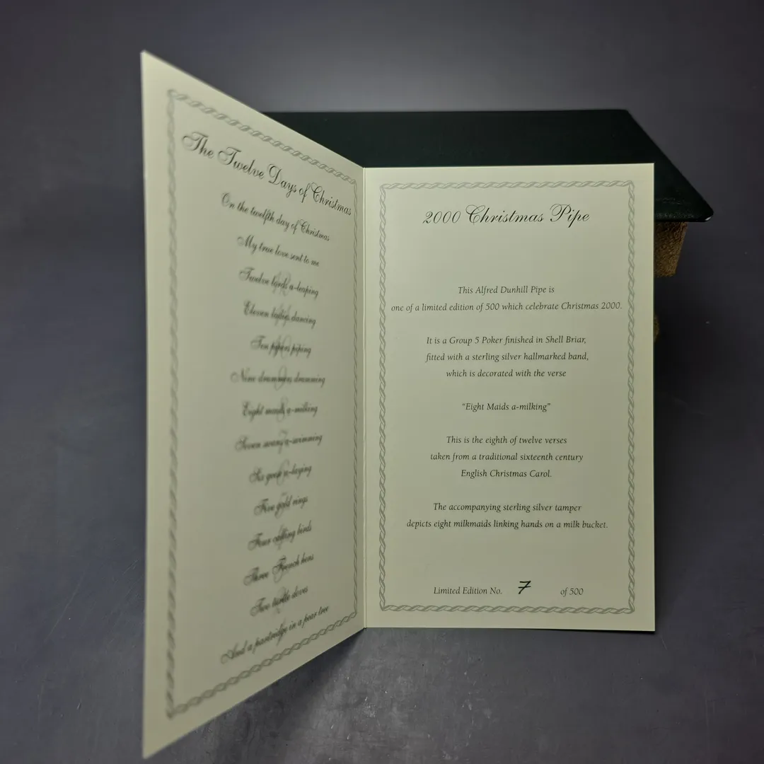 While special, annual “Christmas” pipes today are most commonly associated with Peterson and Savinelli, there was a time when this trend was dominated by English pipe companies. BBB, for example, made Christmas pipes at least as early as the 1960s, and Comoy’s soon followed. Similarly, Dunhill began releasing its own, limited edition Christmas Pipes in 1980 but, being Dunhill, the make went a little further in their celebrations than most. In the 1990s, Dunhill began to add extra thematic elements to these seasonal releases, with 1993-2004 being a series of pipes based on the Christmas carol “The Twelve Days of Christmas”; 1993 was “A Patridge In a Pear Tree,” for example, 1994 was “Two Turtle Doves,” and so on. The 2000 release, being the eighth in the series, followed the theme of “Eight maids a-milking. The pipe itself was, quite fittingly, rendered as a stout and sturdy poker shape, complete with a sterling silver collar. As with other entries in the series, the 2000 release also included an ornate, sterling silver tamper depicting the verse’s eight maids.