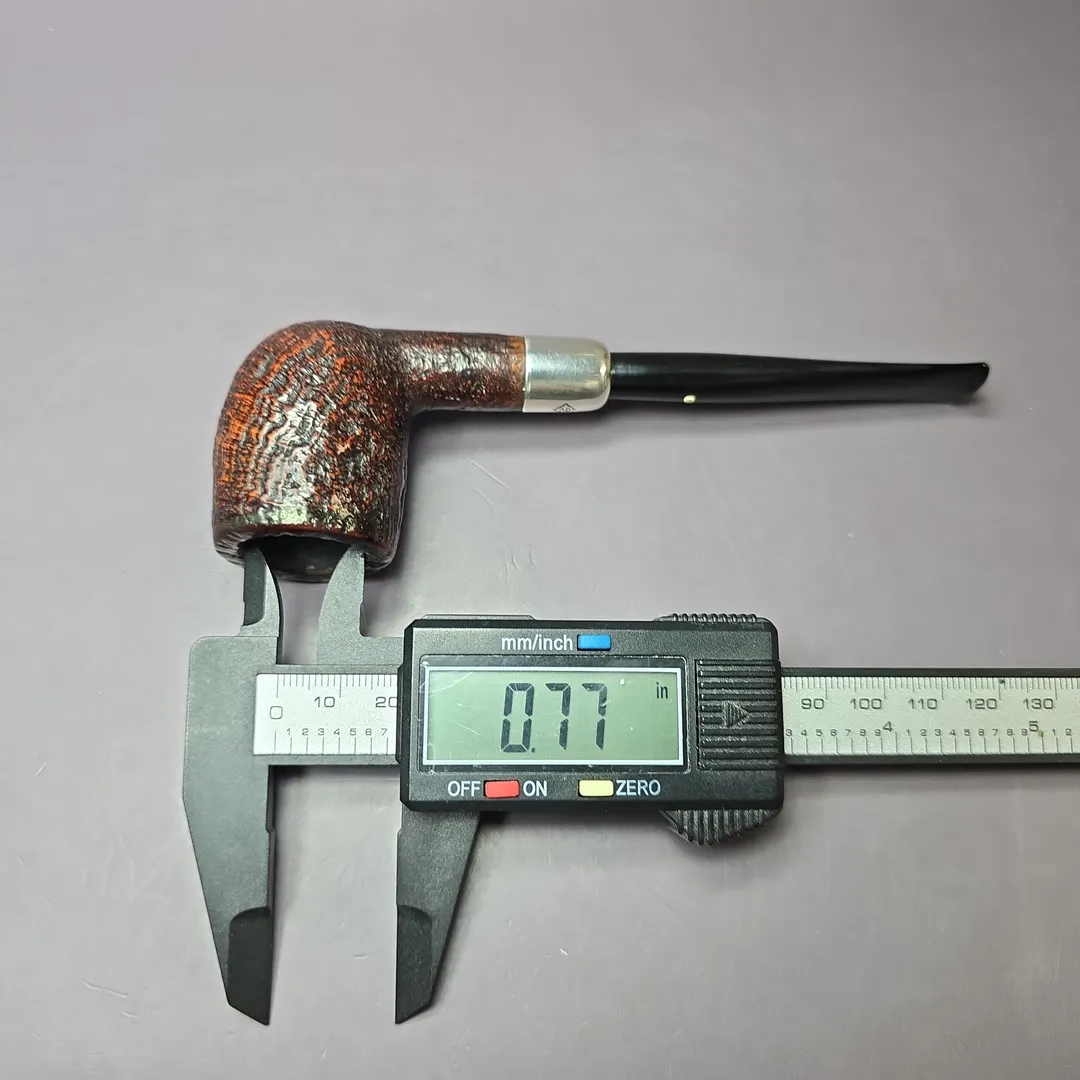 While the question of “who did it first?” remains contentious, Dunhill was undoubtedly one of the pioneers of sandblasting, securing the first patent for such finishes in 1918. And while many pipe smokers extol the virtues of perfect straight grain, there are just as many who adore the crisp and rich textures of a sandblasted bowl, instead expressing in relief the briar’s natural grain patterns. Though the sterling silver army mounted shape 57 billiard is notoriously difficult to date, owing to its frequent lack a date code, it is a fair assumption that this is a mid-century make. As a last note, this Dunhill has a twin bore stem. It isn’t the first time I’ve seen this, and I have heard this referred to as a “Two Way” system that was briefly offered by Dunhill long ago, so my thinking is that it’s original.