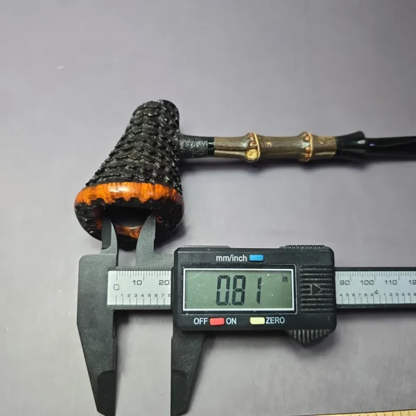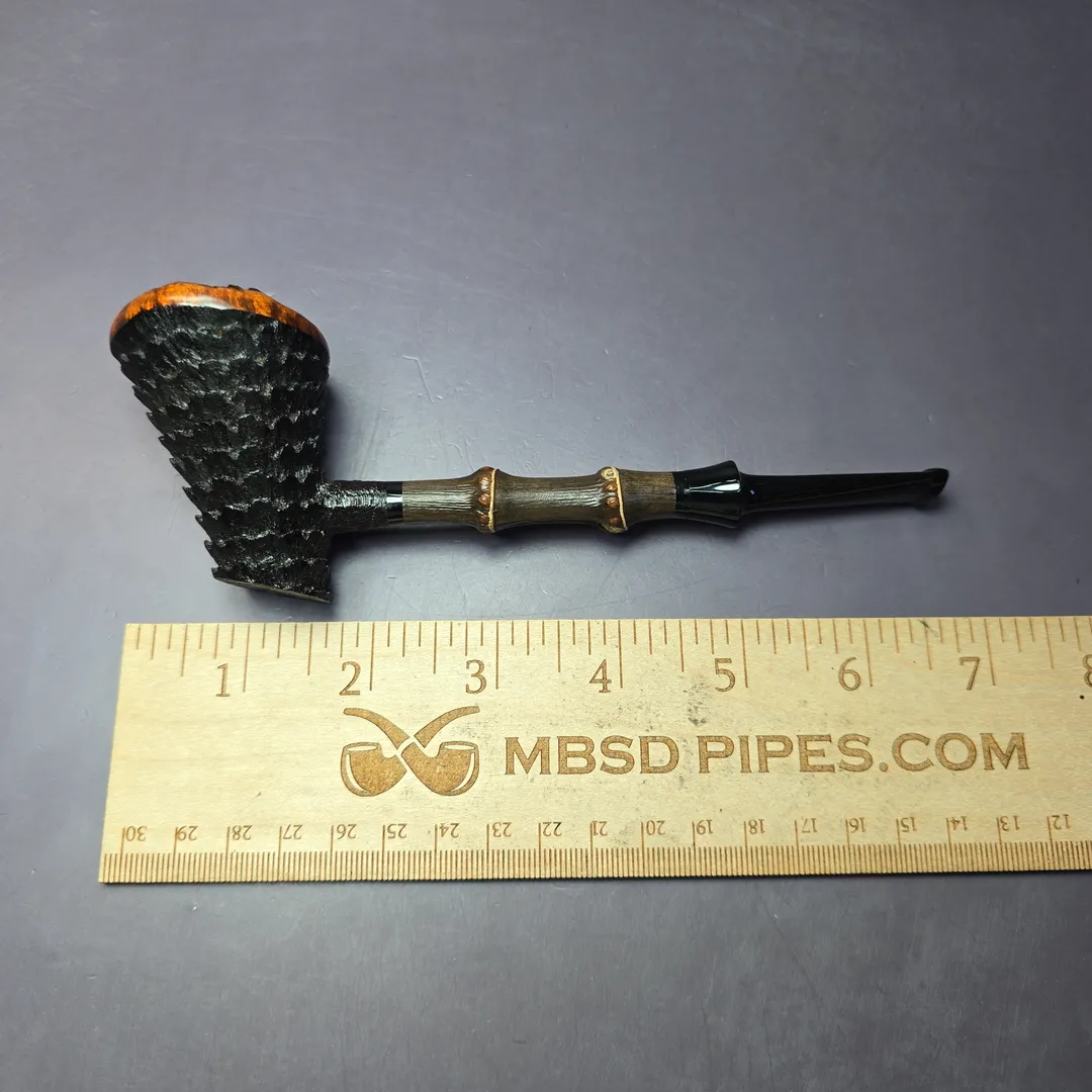 There are some artisans who are well known and widely acclaimed for their sandblasting techniques. Bill Taylor of Ashton, J.T. Cooke, Lee Von Erck, and so on. The reason these figures are so well known for their sandblasts is not just because they mastered pre-existing techniques, but went so far as to create their own. Pavel Holub’s Eclesias pipes display a similar ingenuity, with his “Dragon Scale” sandblasting producing results that are as tactile and densely layered as their namesake. This example has been applied to a an otherwise quite classical poker shape, albeit with a long, bamboo shank extension and a rim of plateaux burl. Though it’s a long pipe, it’s exceedingly lightweight. Tom Eltang, eat your heart out.