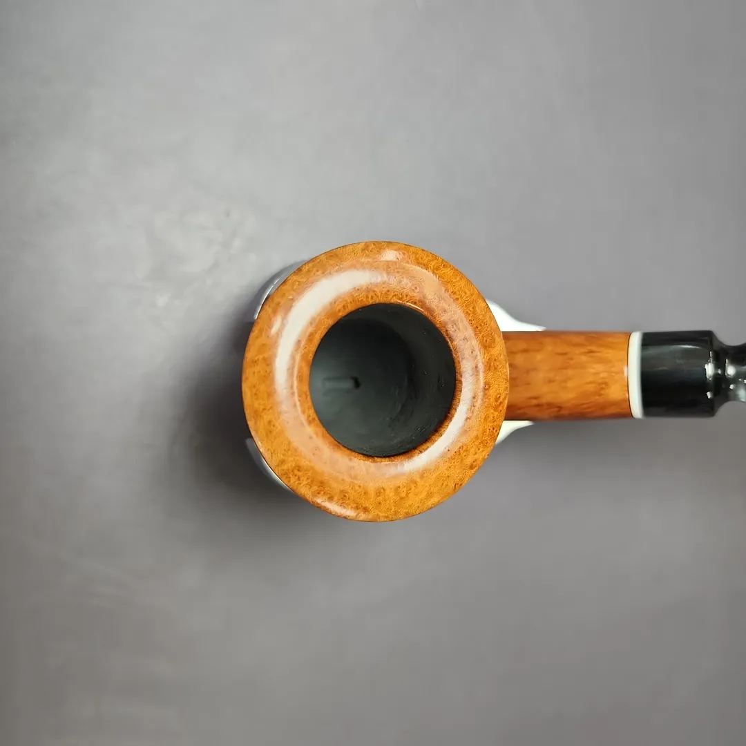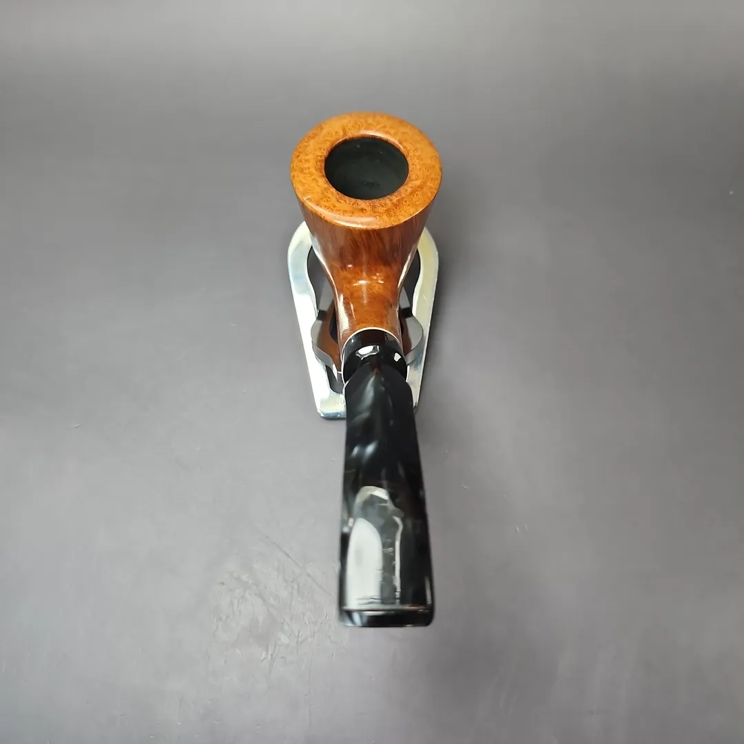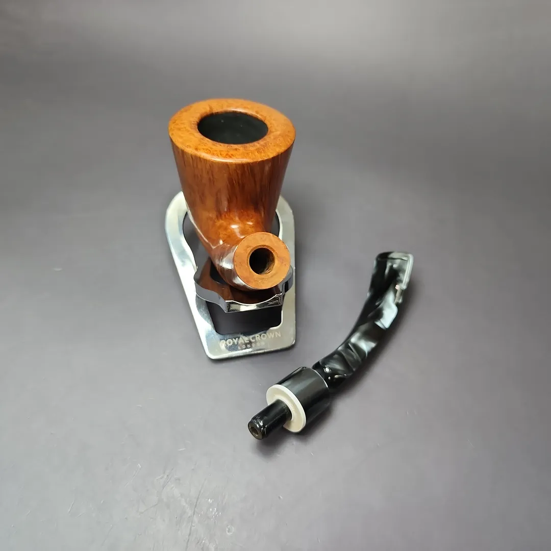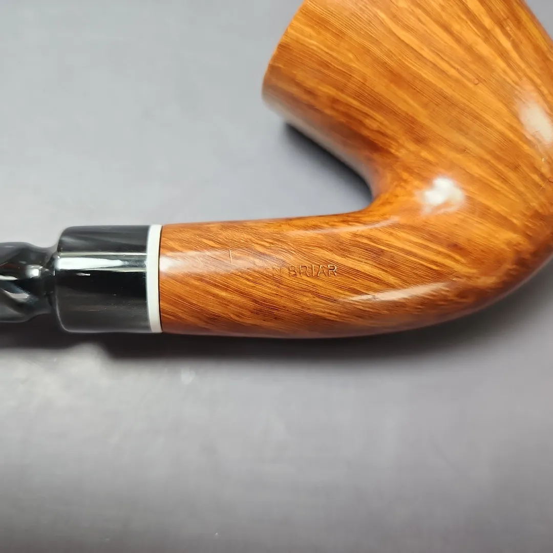 If I was in charge of Edward’s and wanted to position the company as truly being the “American Charatan,” I would probably use a pipe like this one to justify such a claim. It’s an extraordinary piece, being a very large bent Dublin shape with the kind of tight-consistent straight grain and bird’s-eye that would have earned a Selected, or even a Supreme grade had it been turned at the English make. The stem work is more characteristically American in vein of its then-nascent freehands, though this doesn’t diminish the pipe’s quality by any means. If anything, the smoky, faceted mouthpiece, along with the ivory-like acrylic accent at its base, only adds to its distinction.