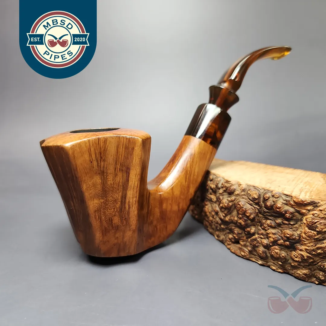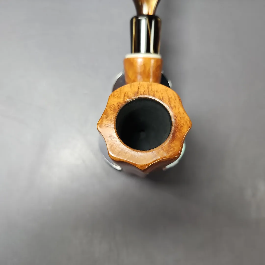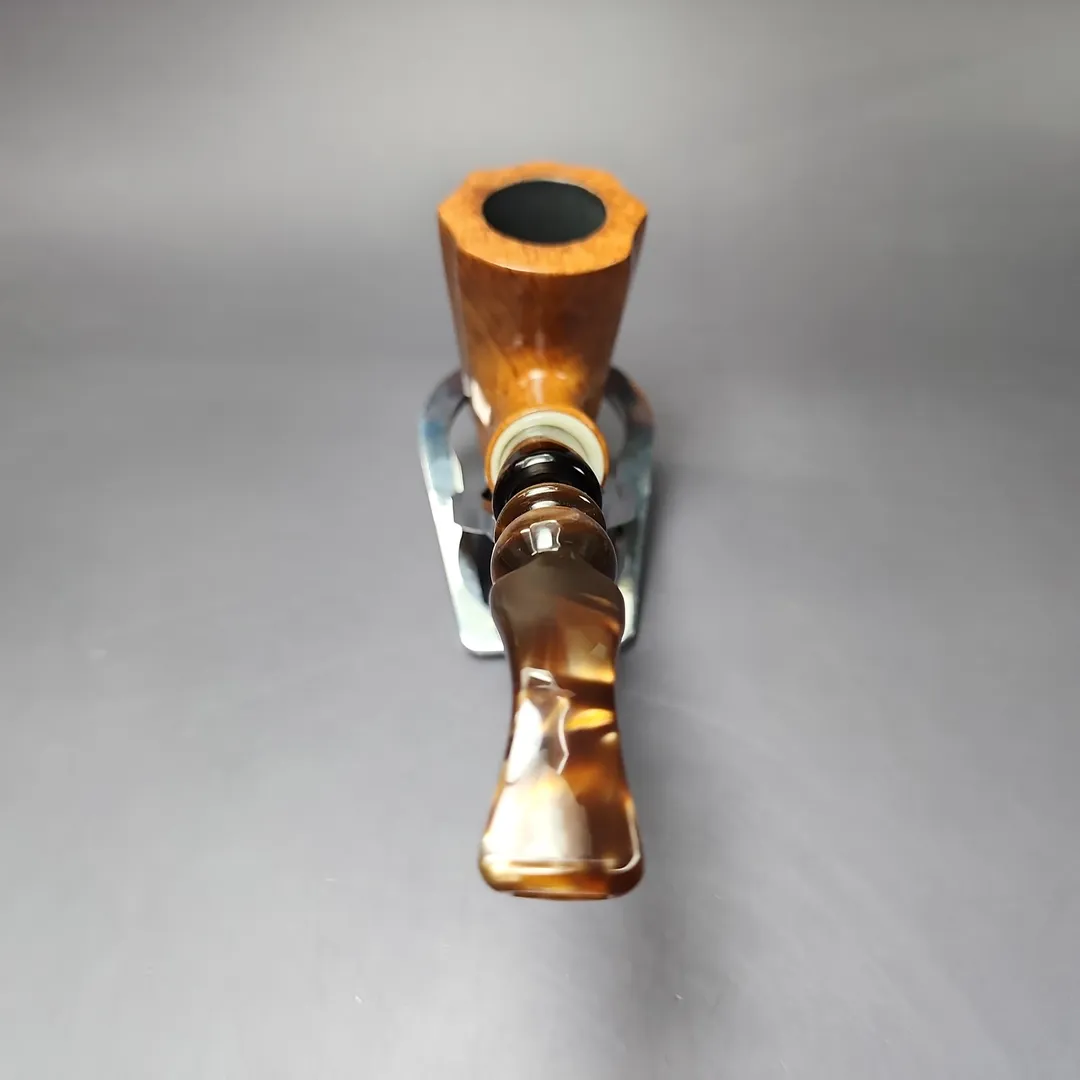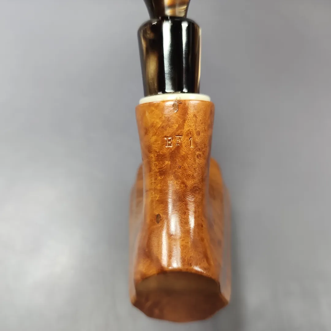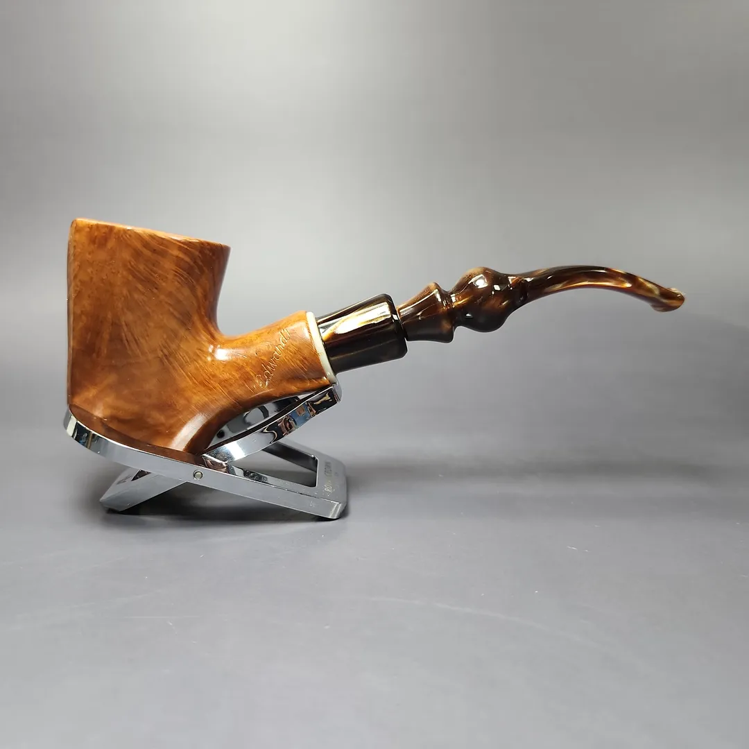 While it has, at times, contracted other parties to produce pipes under its name, Edward’s used to manufacture both pipes and tobacco of its own, with a view to becoming the “American Charatan” for the former. This particular pipe looks to be from around the 1960s-1970s, back when Edward’s prided itself on using choice Algerian briar (which the Algerian war of independence later interrupted the supply of) which was specially oil-cured and very lightly finished. In the case of this one, you can see the nod to Charatan in its unique design and hybridization of various shapes, but there’s also a good deal to it that fits more with the early American freehand scene, especially in the use of an acrylic army mount and elaborate mouthpiece.