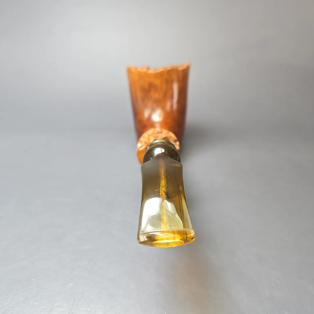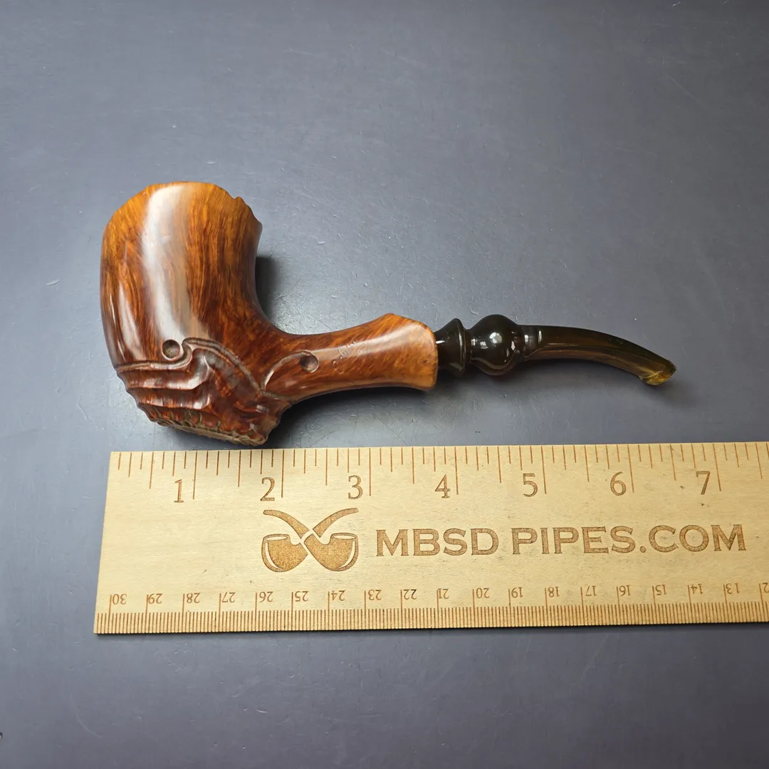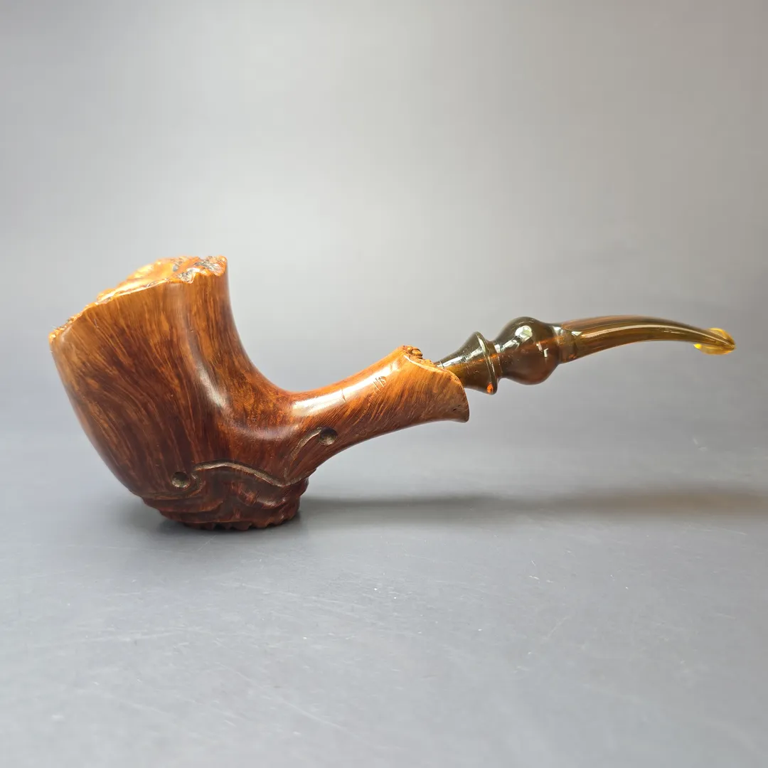 This happens to be one of those famed Algerian briar pipes from Edward’s, and is also a quite fascinating take on the freehand genre. While it is a freehand, it’s not entirely freeform, instead incorporating a wave-like motif that makes for a very unique sitter. Also of note is the filigree-style spot carving at the pipe’s base, a technique that would become a hallmark of the first great movement of American freehand pipes.