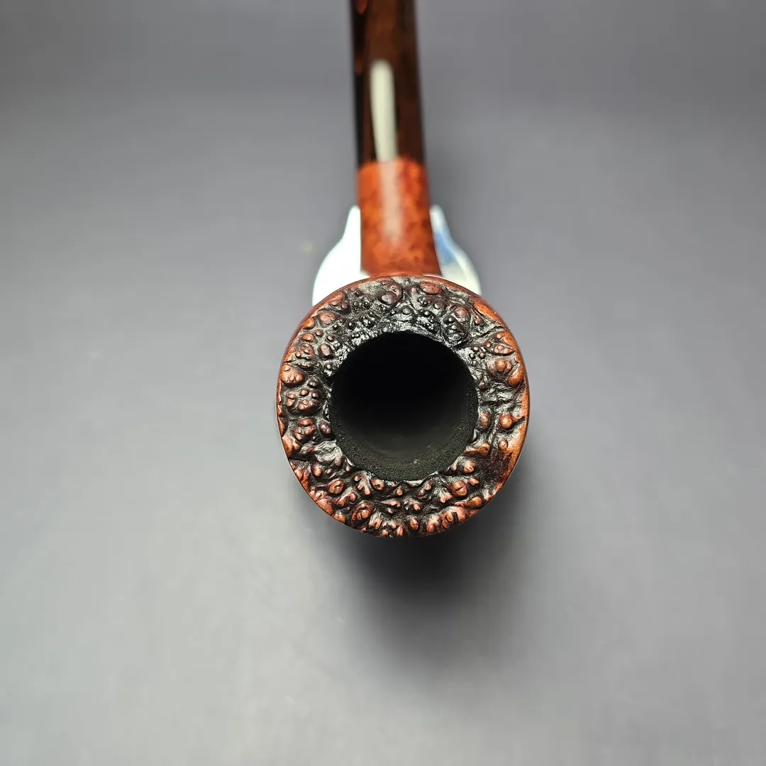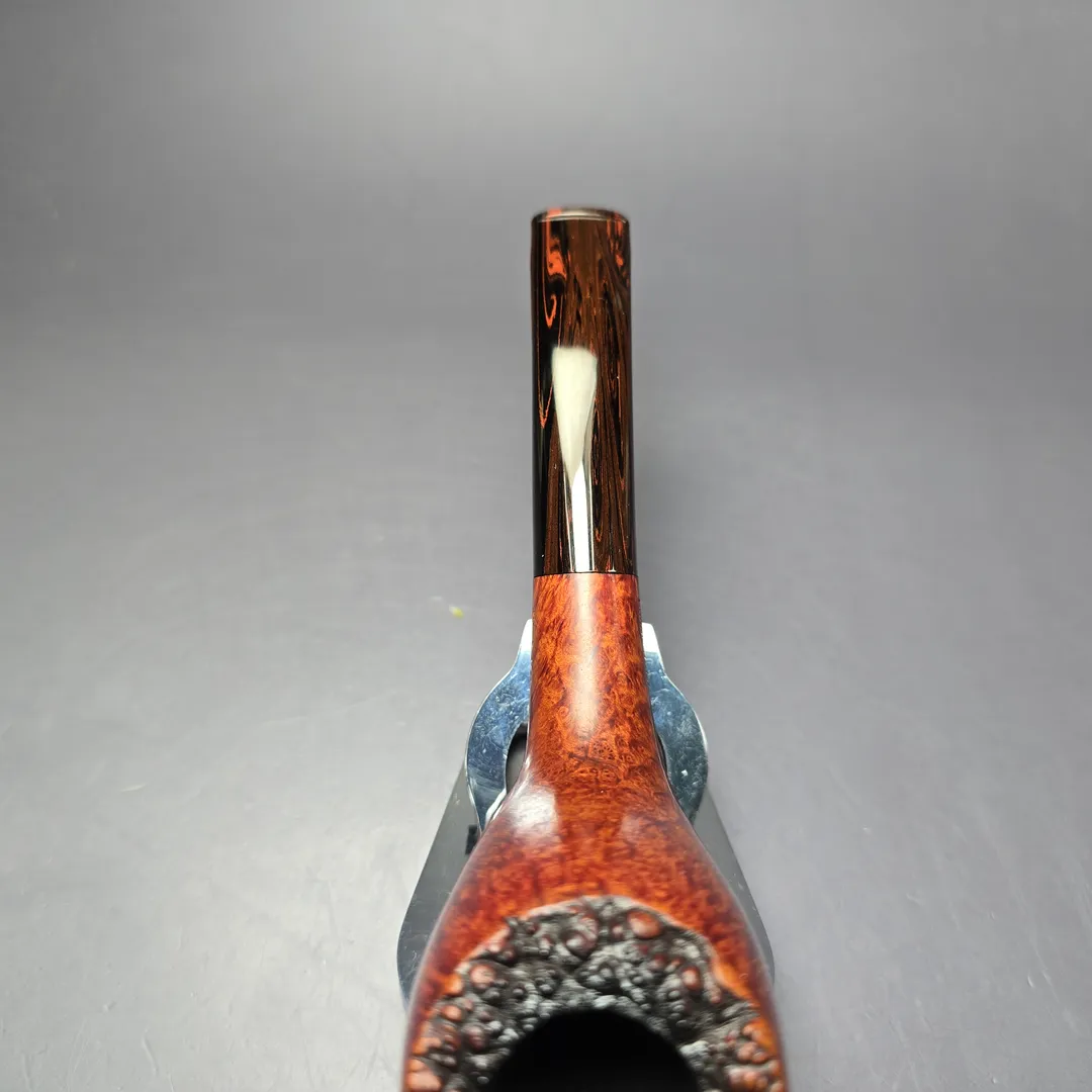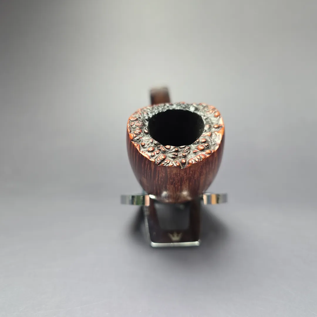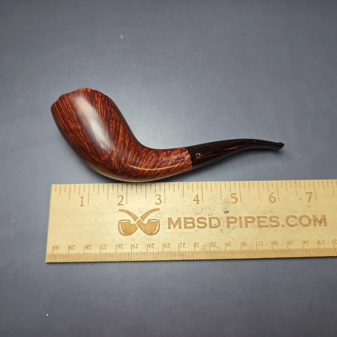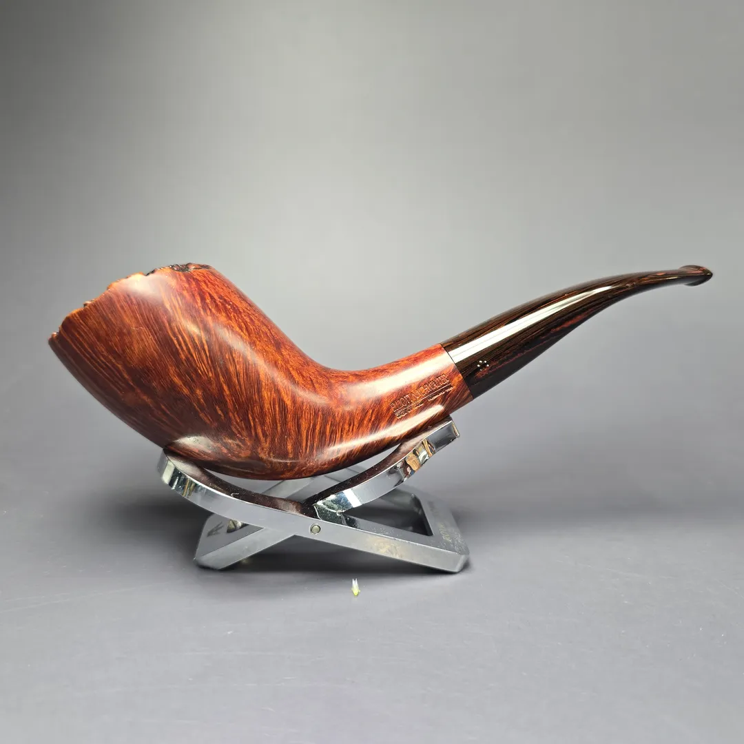 This particular pipe, from what looks to be Nachwalter’s post-1996 career, is a beautiful, flowing rendition of a rather Danish, plateaux-topped horn shape—in fact, one could easily picture it adorning a very upmarket Viking helmet. Dressed in a light brown finish that highlights the flame grain lapping the sides of its bowl, the design is completed by a hand-cut cumberland mouthpiece.