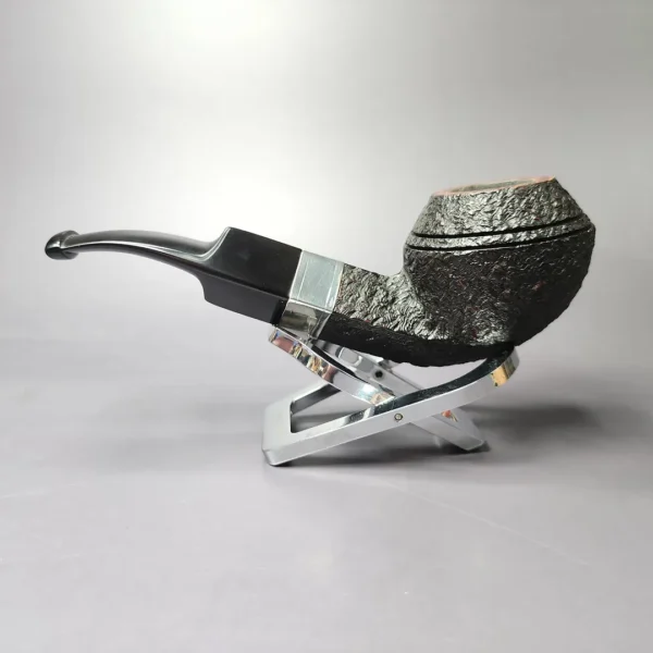 Much like the pipes Les and Dolly Wood made for Astleys, Elwood pipes are essentially Ferndown pipes by another name. This means that their finishes are equivalent to the latter and, even though they did not bear the equivalent stamping, the standard Ferndown terminology was used in Dan Pipe’s advertising. This particular Elwood is essentially a Ferndown “Bark,” taking the form of a traditional, stout bent bulldog, with an engraved, 10mm sterling silver collar turned by the master silversmith himself.