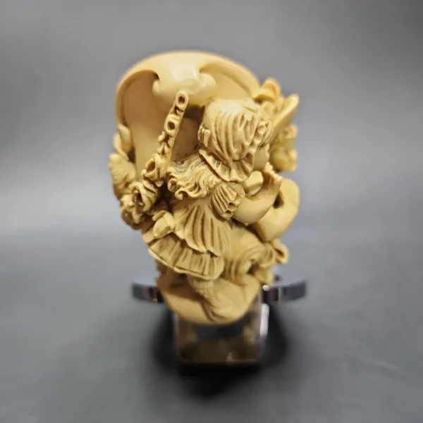 I’ve said before that the closest analog to meerschaum carving in fine art (as traditionally defined) is sculpture. More specifically, its closest analog is subtractive sculpture, such as in the medium of marble. A question I’ve sometimes wondered, however, is of which period in the history of sculpture that meerschaum carving would be analogous to. With many meerschaum pipes the guiding motif is the bust, which is a fairly constant one across the history of fine art, whereas designs as intricate and—more importantly—lively as this one appear to have one very specific precedent: the Baroque. More dynamic, even Dionysian, than its Renaissance counterpart, Baroque sculpture was very much home to scenes similar to this one, and which also become more detailed and vibrant the more one examines them.
