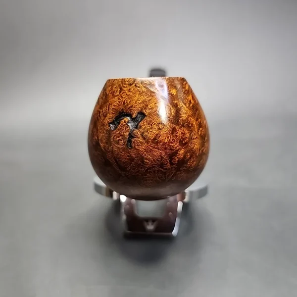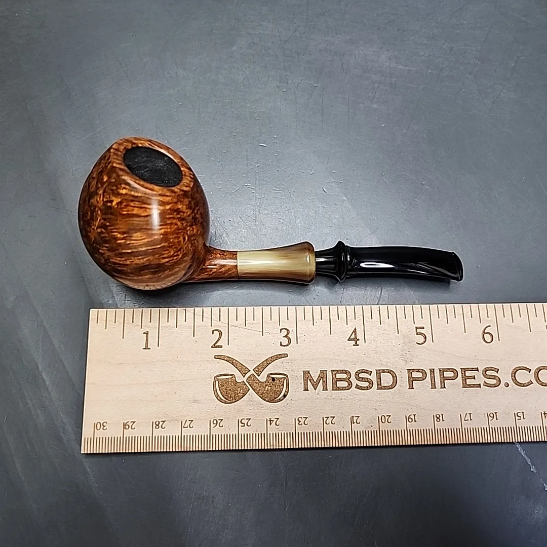 I’ve categorized this pipe from Indonesian carver Anggi as a bent egg, as it did remind me quite a bit of the Brazilia shape 02 that Stanwell once made. Like Stanwell’s 02, it features an egg-like side profile with a smooth upward bend, and like the Brazilia iteration it features a long, genuine horn ferrule, stabilized by a brass ring mount for its mortise. Unlike the 02, however, this one’s bowl is distinctly wide across its horizontal axis, in a way that recalls the Danish “potato sack” pipes carved by figures such as Sixten Ivarsson and Jorgen Larsen. But, it isn’t quite a potato sack either. Instead, it is more like the “lens” shape that later artisans began to develop. It is very well done, too, with the briar having been carved so that the bowl’s narrower port and starboard sides show off cross grain that transforms into striking bird’s-eye patterns as it crosses into its wider bow and stern. A last touch, reminiscent of certain Japanese pipe aesthetics, comes in the form of a kiss of plateau on the bowl’s forward face.