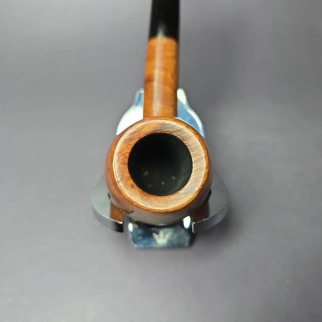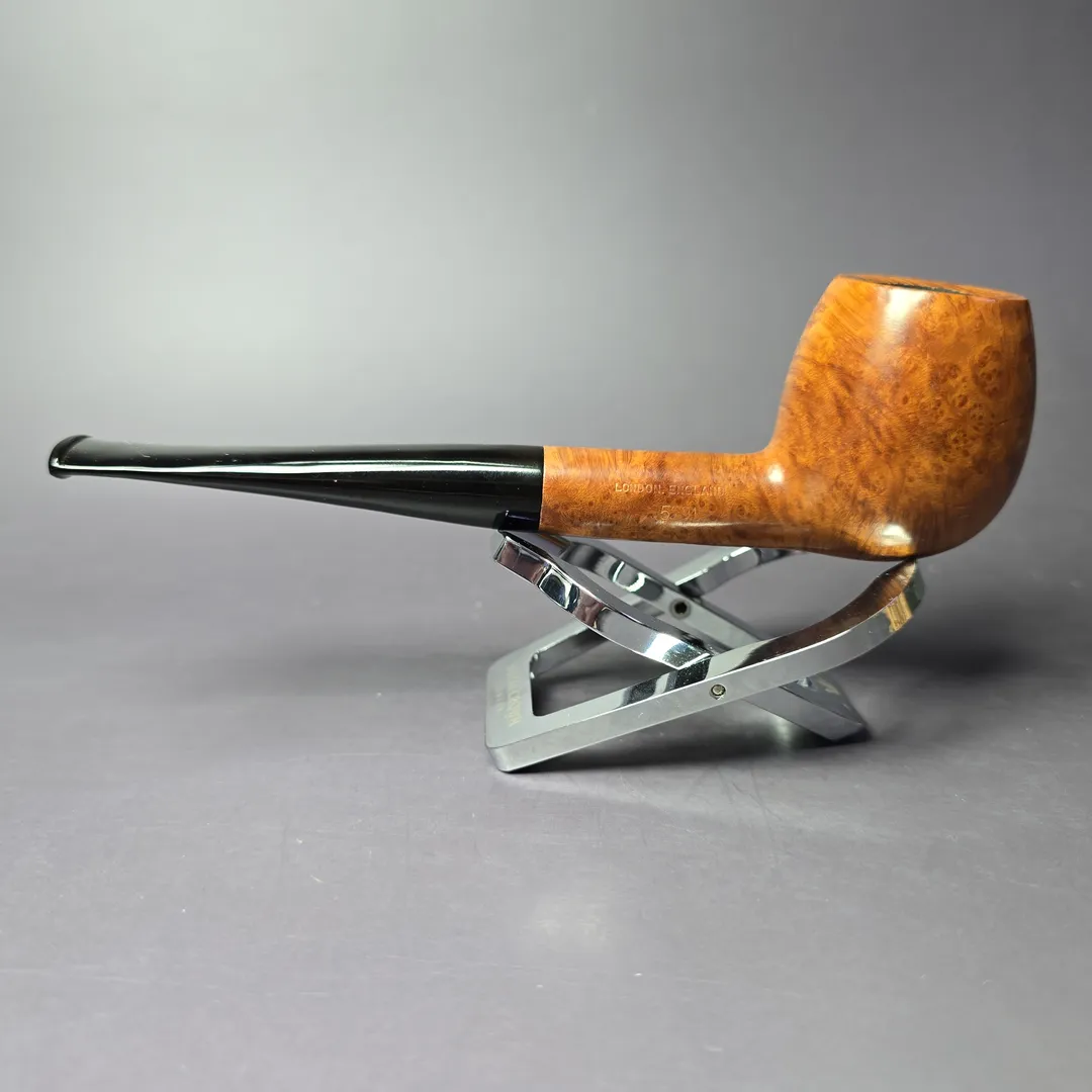 One of GBD’s earliest slogans was “Pipes with a Pedigree”, which certainly wasn’t wrong, but the “Pedigree” line itself was a cut above even GBD’s other pipes. This traditional apple, for example, is covered in dazzling bird’s-eye, left in its natural, beautiful state by the lightest finish. Based on the country of manufacture stamp and brass “GBD” stem inlay, this pipe will be a pre-1980 piece, made prior to the early 1980s Cadogan Investments merger.