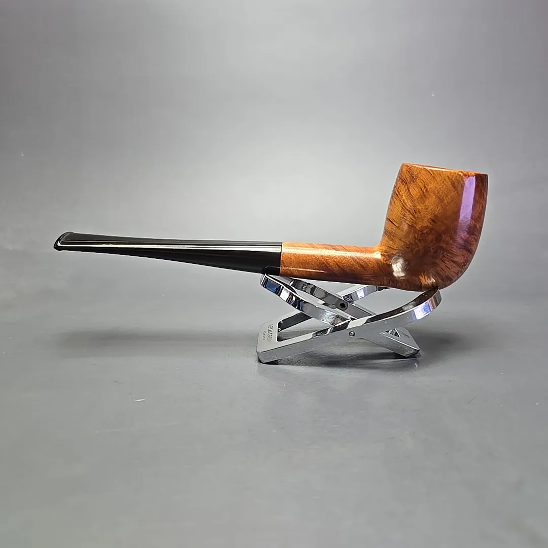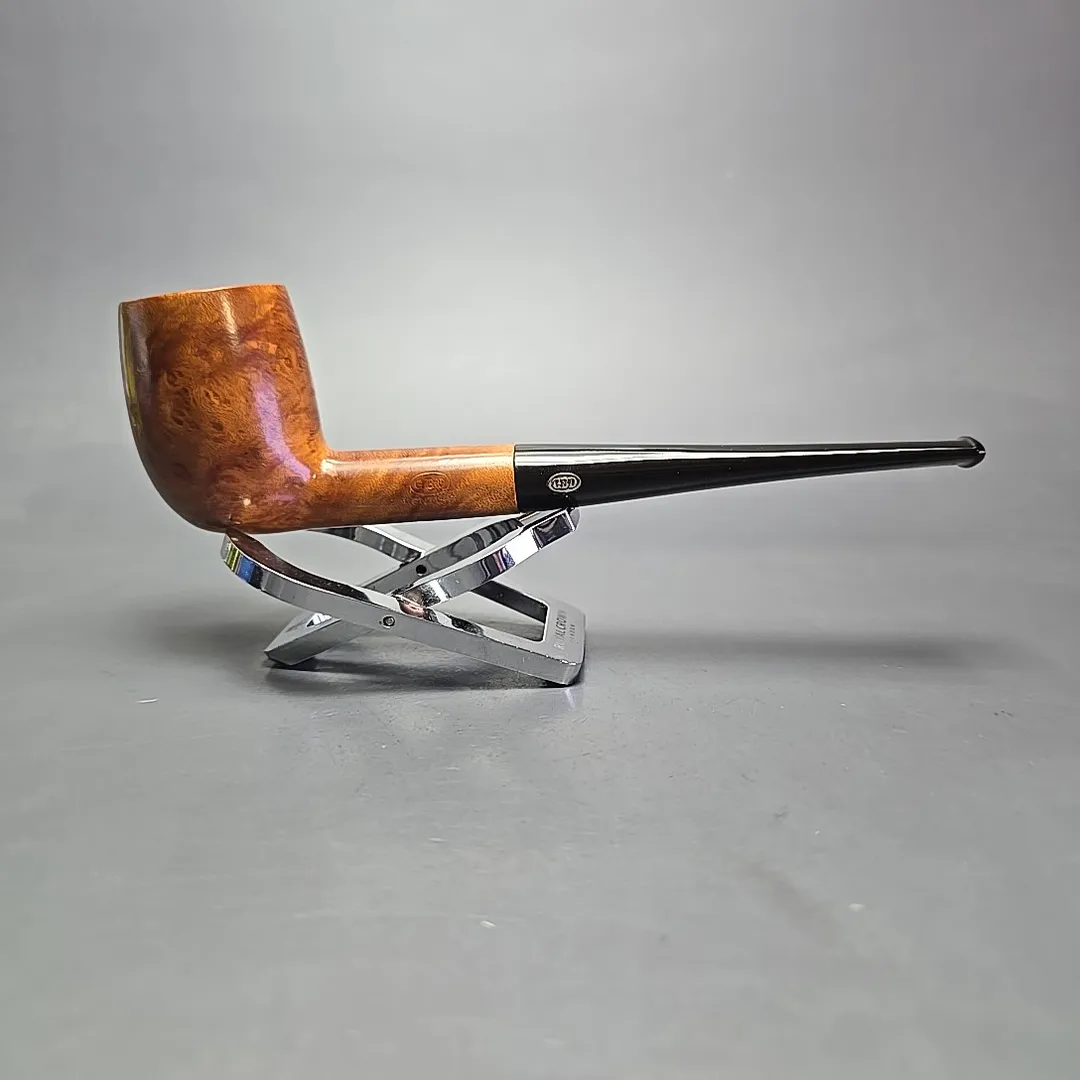 GBD’s Century line was introduced in 1950 and, as you might guess, was intended as a commemoration of 100 years of Ganneval, Bondier & Donninger’s storied make. This one takes the form of what could reasonably be described as a Bing billiard, with a long, slender frame and relatively lightweight stature. It’s a worthy addition to GBD’s commemorative line, too, having been turned in a cross-cut fashion to maximize the bird’s-eye on either side of its bowl. As for dating, it’s definitely pre-1980s, and thus pre-Cadogan Investments merger, as evinced by its nomenclature (LONDON.ENGLAND) and brass stem inlay.
