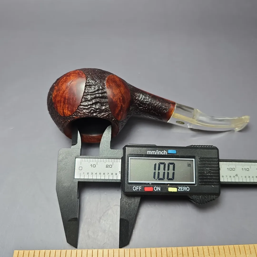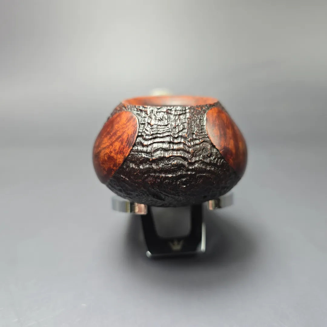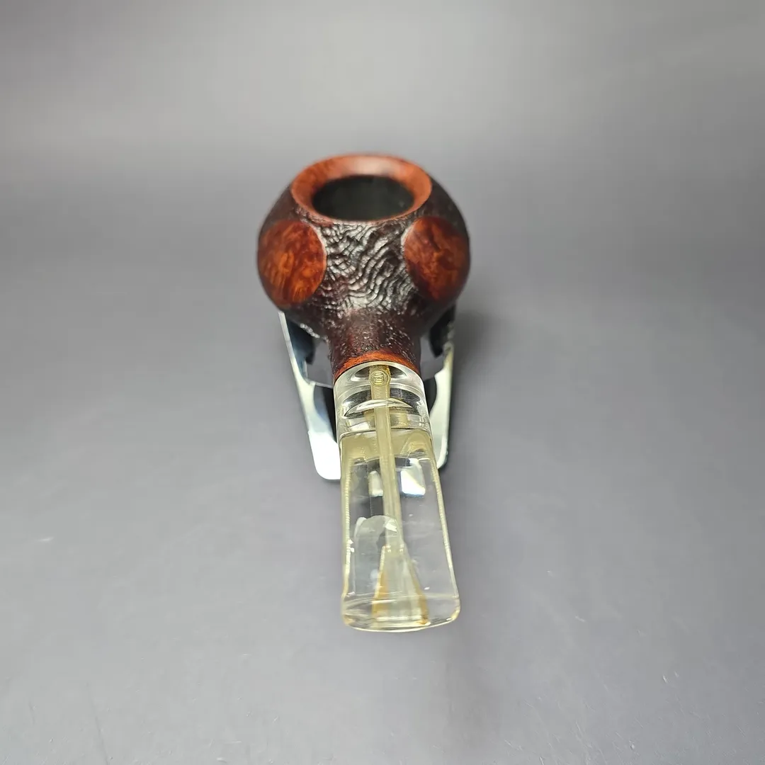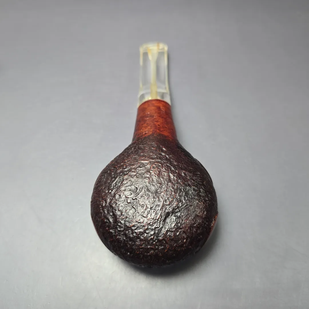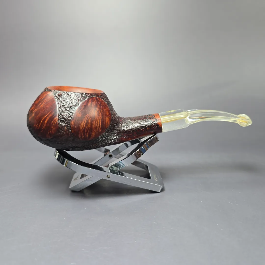 GBD’s oversized pipes were grouped into one of three categories: Conquest, Collector, and Colossus. The latter was the largest of the three, though the dimensions this was in relation to varied by shape. In the case of the 9643, which could be regarded as a diplomat, a tomato, or an author, depending on who you asked, oversized meant wide. In a manner not unlike the famous Sixten Ivarsson Ukulele, GBD’s Colossus variant of the 9643 was decidedly broad and squat, with a wide chamber well-suited for mixture and ribbon cuts. This one comes from the Fantasy line, which featured a mixed finish of smooth and sandblasted sections and, in some cases, one of GBD’s iconic perspex stems, as seen here. On a last note, based on the nomenclature and stem inlay, this should be a pre-1980s, pre-Cadogan Investments merger GBD pipe.