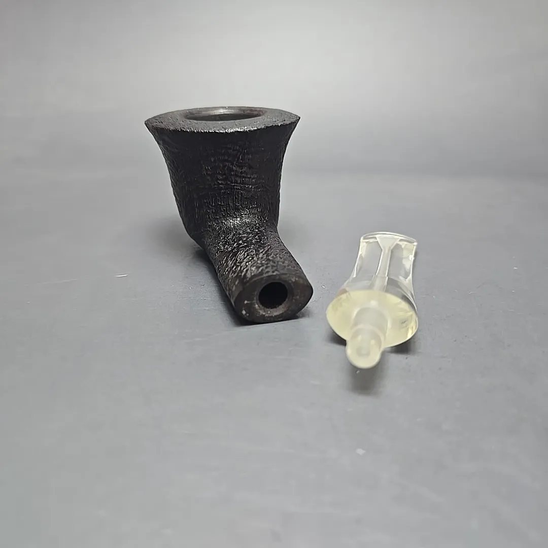 In the case of the sandblasted Prehistoric line and, more specifically, the Prehistoric Perspex. The Prehistoric was, originally, a dark, craggy relief finish, typically paired with a similarly dark black vulcanite mouthpiece. GBD’s marketing materials did a great job of highlighting the difference the Perspex variation made, noting that the latter’s “crystal clear mouthpiece creates an attractive contrast to the deep dark finish.” If anything, this undersells the effect of GBD’s signature material, as the addition of a Perspex stem juxtaposes a translucent, yet still quite bright, glassy-smooth element with the bowl’s craggy, near-black aesthetic. The bowl and the mouthpiece in this instance might as well be polar opposites, and perhaps that’s exactly why they work so well together.