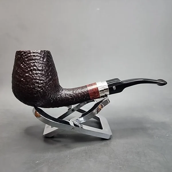 For those who don’t know, Georg Jensen pipes can be roughly divided into two categories: their standard pipes, and their higher grade pipes. This difference is marked by the addition of one word in the nomenclature of the latter – ‘hand.’ I.e., standard Georg Jensen pipes were stamped ‘made in Denmark’ and high-grades were stamped ‘handmade in Denmark.’ This pipe is an example of the latter. It is fancier than many Georg Jensen offerings, having a sterling silver faux-spigot mount connecting the stem to the shank, as well as a fantastic, ring grain sandblast around its quintessentially Danish egg-shaped bowl.