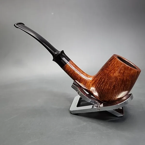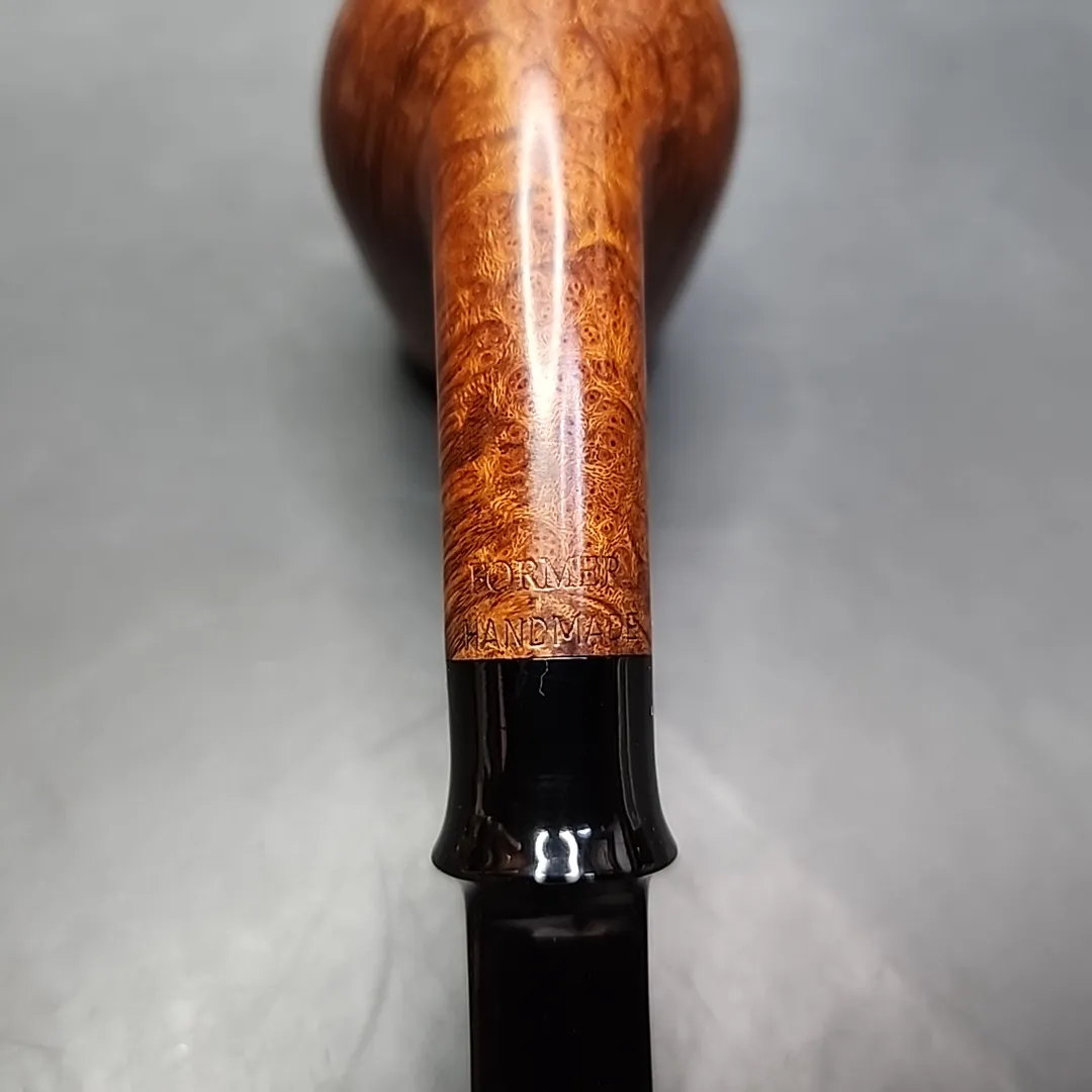 The quarter-bent, almost egg-like, saddle brandy is one of Former’s defining shapes. So much so, in fact, that it ended up being one of the designs he used for his short-lived factory pipe project, Bentley. This is not a Bentley, however, but a Former original, made by Nielsen’s own hand. While uncomplicated in comparison to other pipes by Former and his contemporaries, it is no less masterfully executed. It is also distinct enough to remain unfamiliar to traditional shape charts, especially through the introduction of a slight under-travel by the shank as it transitions into the bowl. The grain around the bowl is uniformly straight, the rim presents a ring of bird’s-eye patterns, and the flared, saddle stem is a final feather in the pipe’s cap.