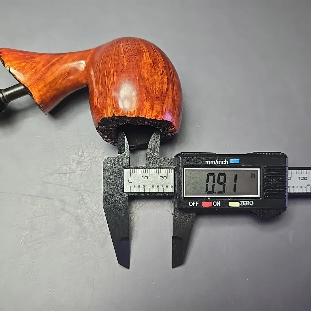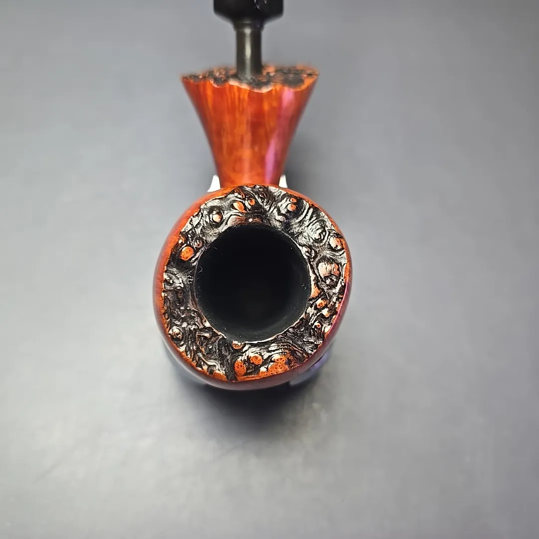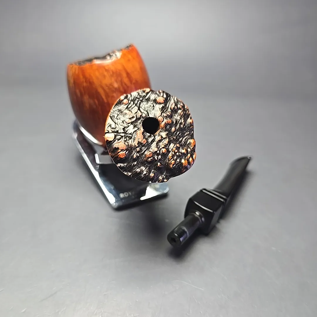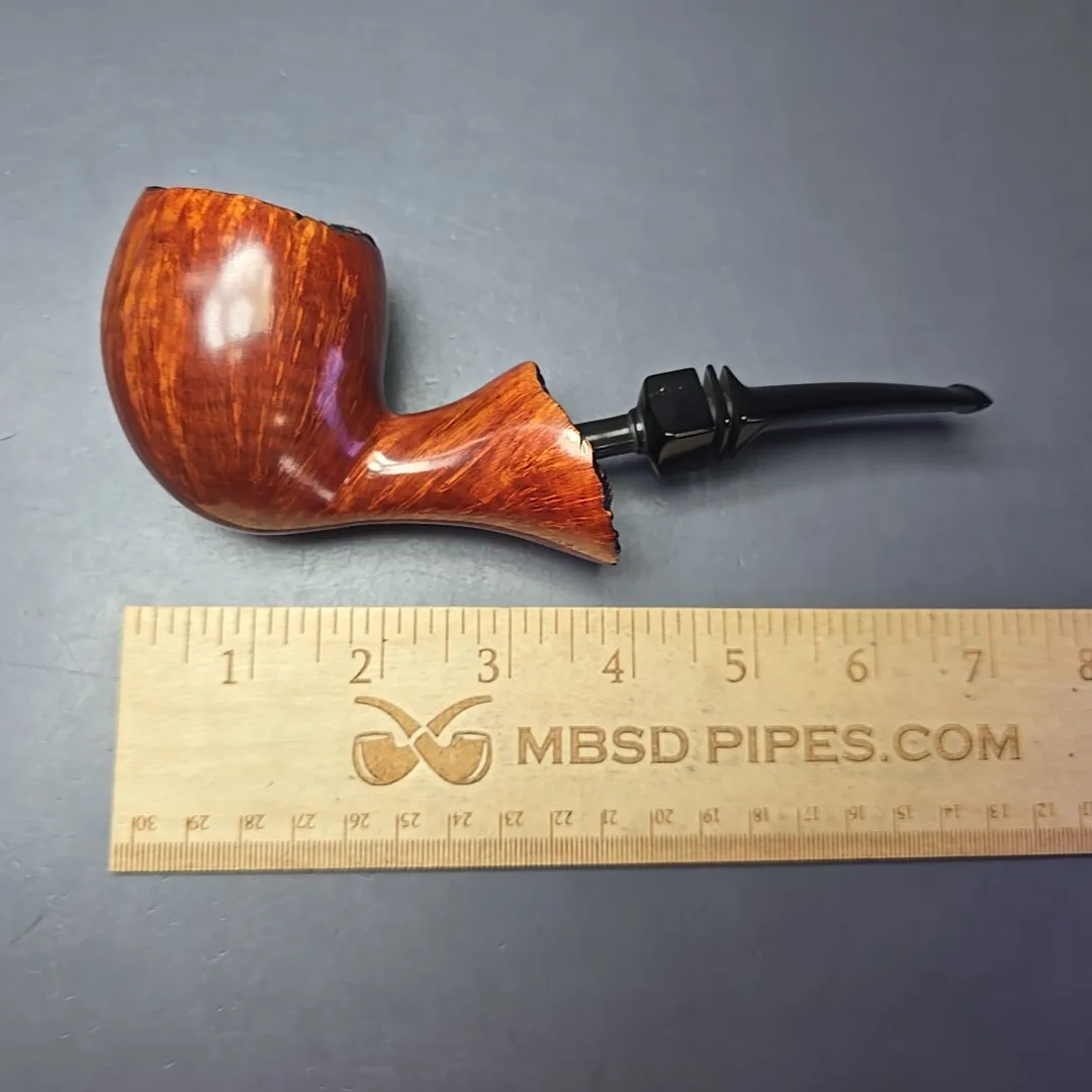 This one looks to be an example of Holm’s handiwork, taking the form of an exceptionally large, straight grain freeehand apple, complete with live plateaux briar at both ends.