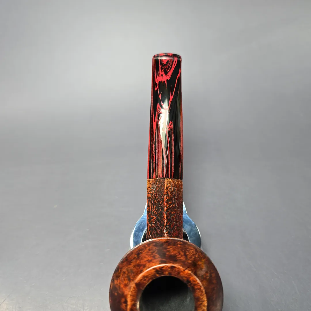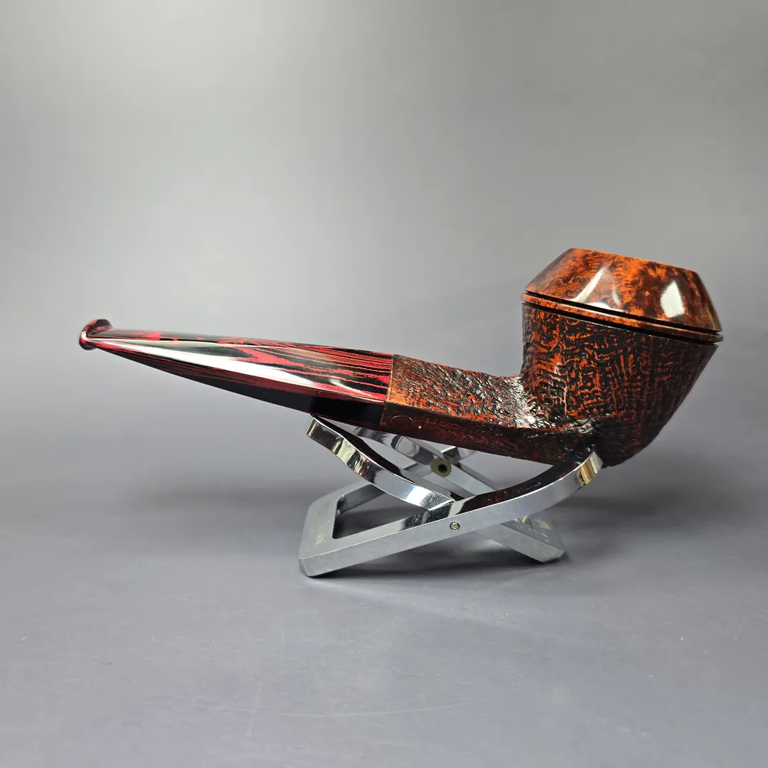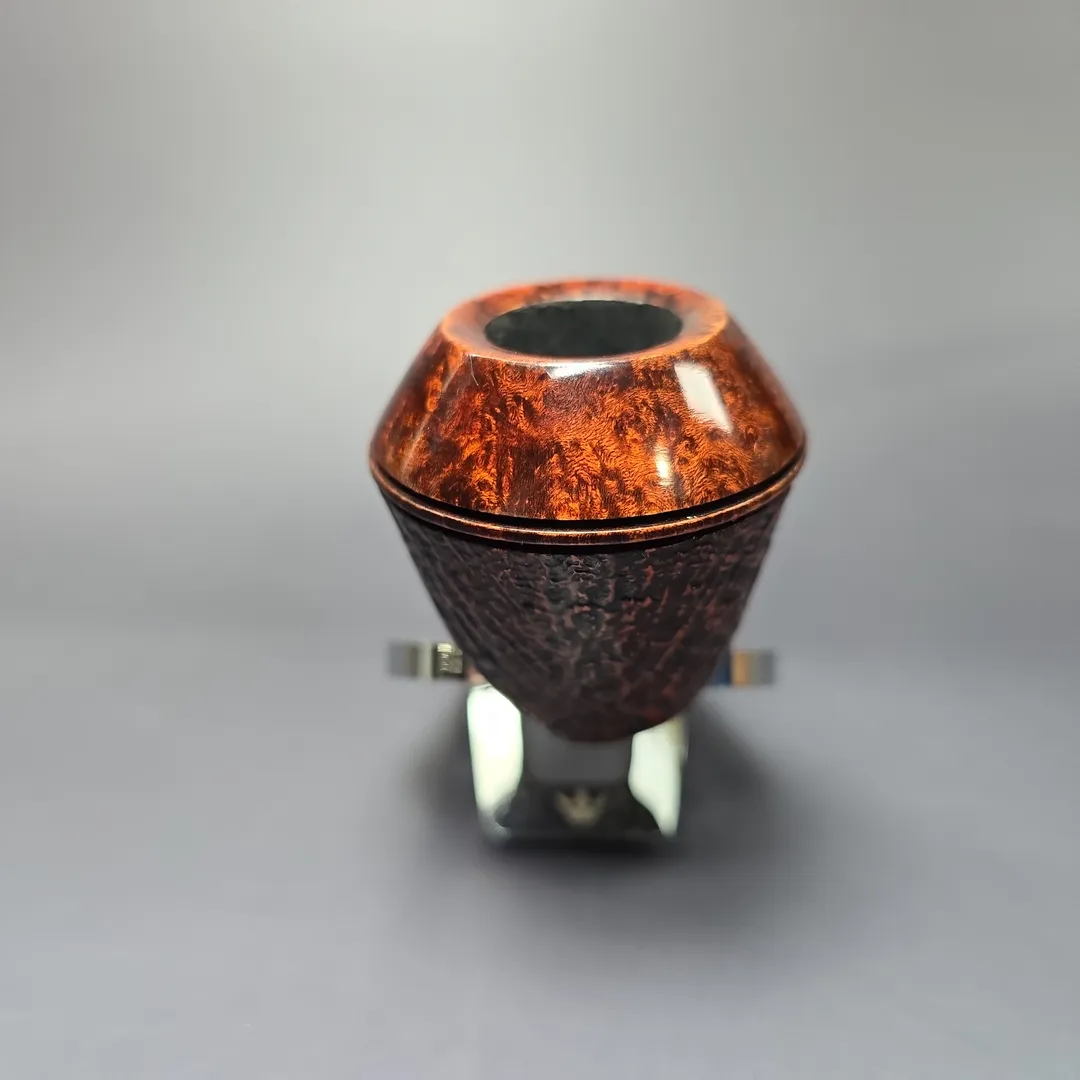 This particular pipe is a beautiful, slightly stout, bulldog, one that deftly plays with contrasts in both texture and hue. Dressed in a partial, ring grain sandblast that ends just as the bowl’s bead-lines begin, both the smooth and blasted sections of the pipe wear a two-tone top-coat that matches perfectly with the pipe’s similarly brindled, hand-cut cumberland stem.
