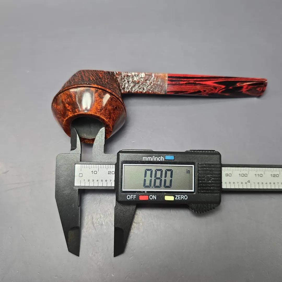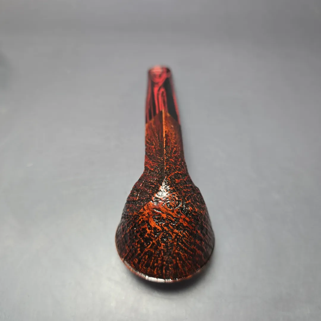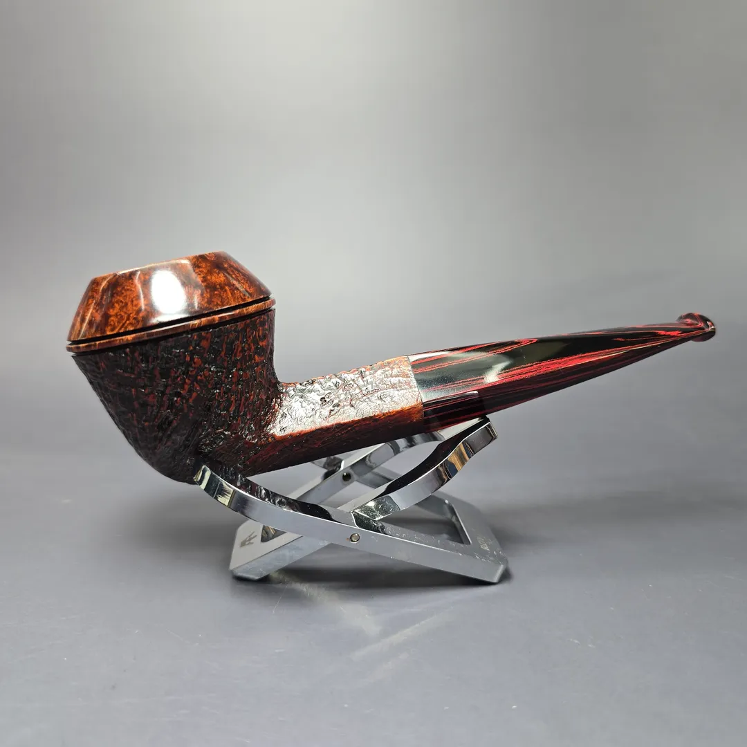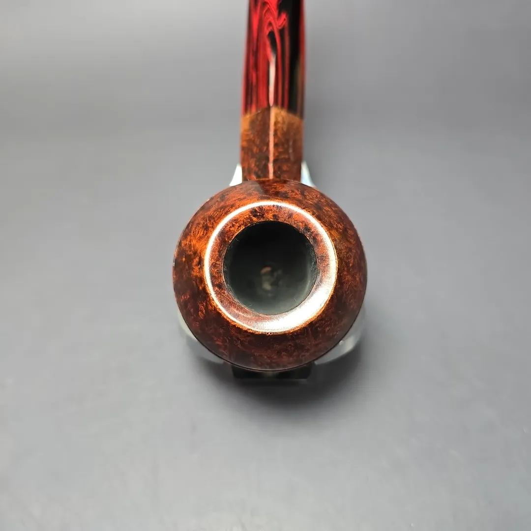 This particular pipe is a beautiful, slightly stout, bulldog, one that deftly plays with contrasts in both texture and hue. Dressed in a partial, ring grain sandblast that ends just as the bowl’s bead-lines begin, both the smooth and blasted sections of the pipe wear a two-tone top-coat that matches perfectly with the pipe’s similarly brindled, hand-cut cumberland stem.