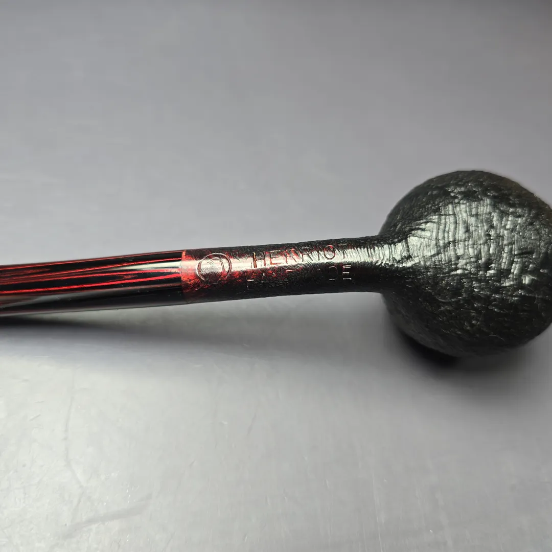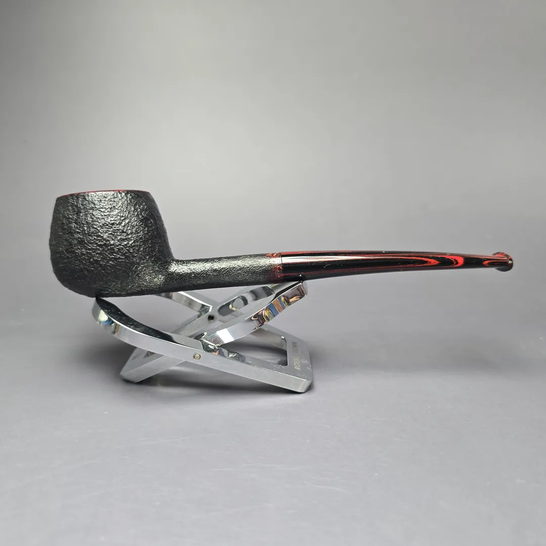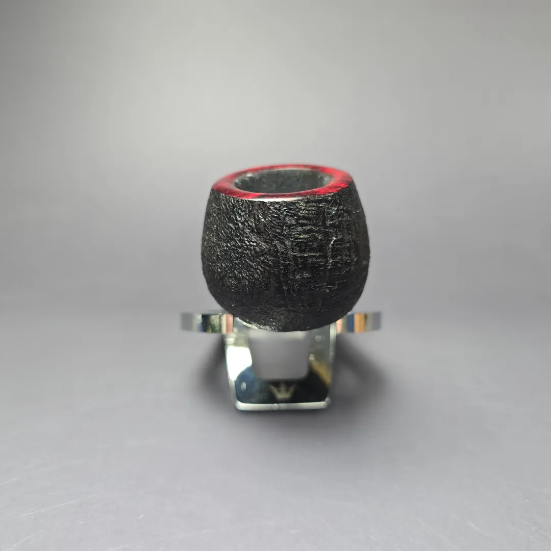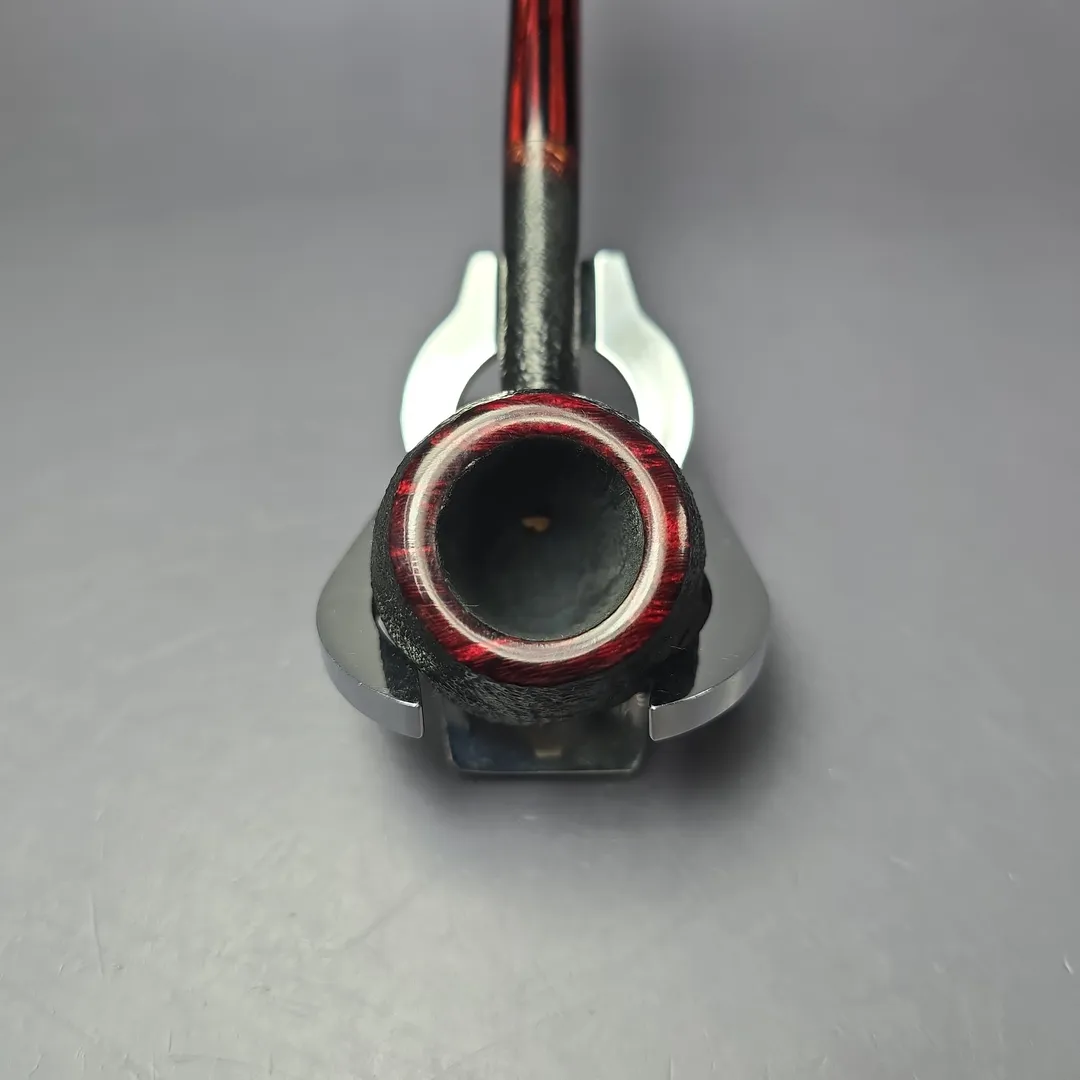 Chris Herriot cut his teeth producing excellent, reserved renditions of Anglo-French classics, and it is these pipes that first brought him to prominence. In a way, one should expect nothing less than a native Brit living in France, a former student and current colleague of Bruno Nuttens, and indeed an alumnus of the Confrérie des Maîtres-Pipiers de Saint-Claude. This prince might be said to be a little more “gothic” in its color palette (it is the season, after all), though it makes sure to stay faithful to the slight and slender shaping of the traditional prince. Dressed in a reserved, near-black partial sandblast, these darker hues are offset by ruby red rim and hand-cut cumberland mouthpiece.