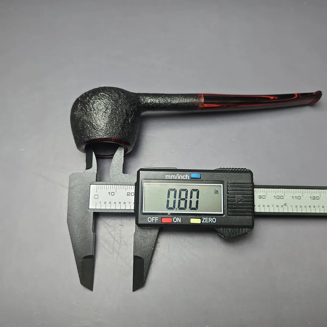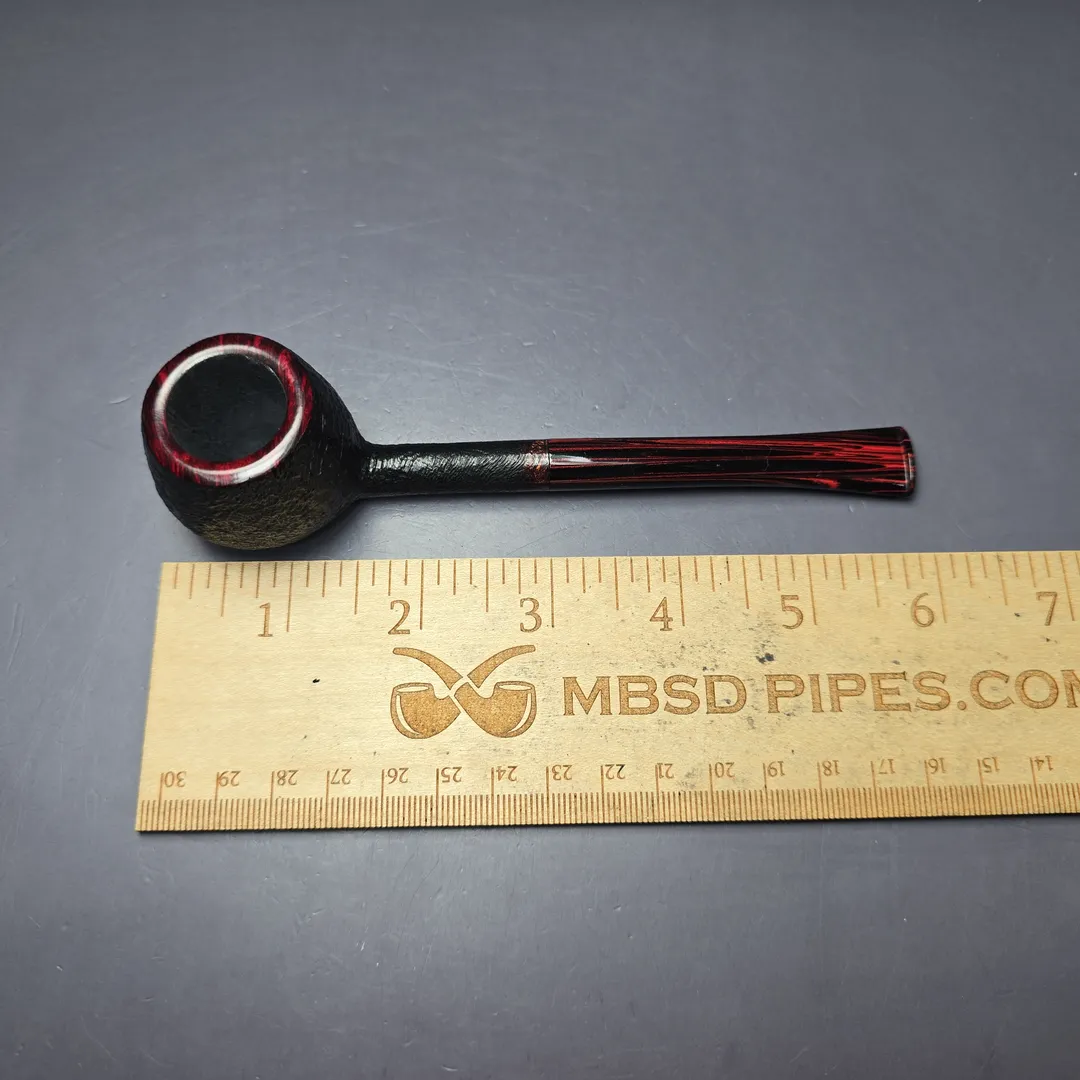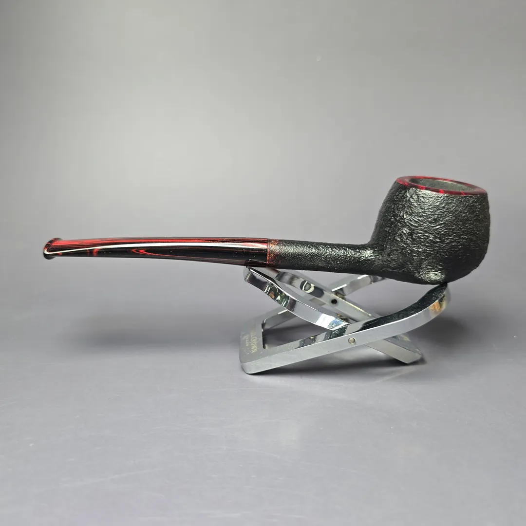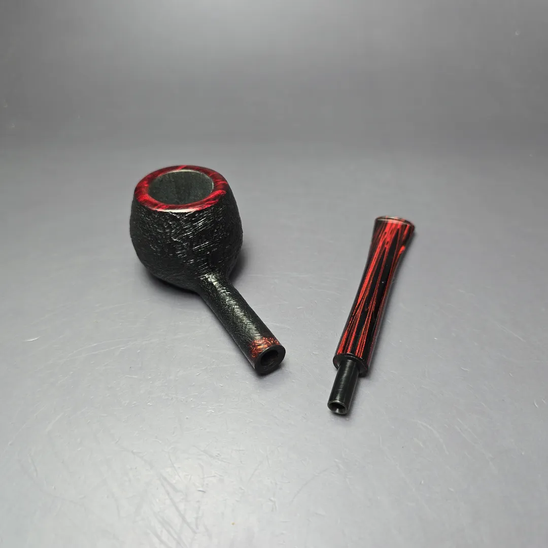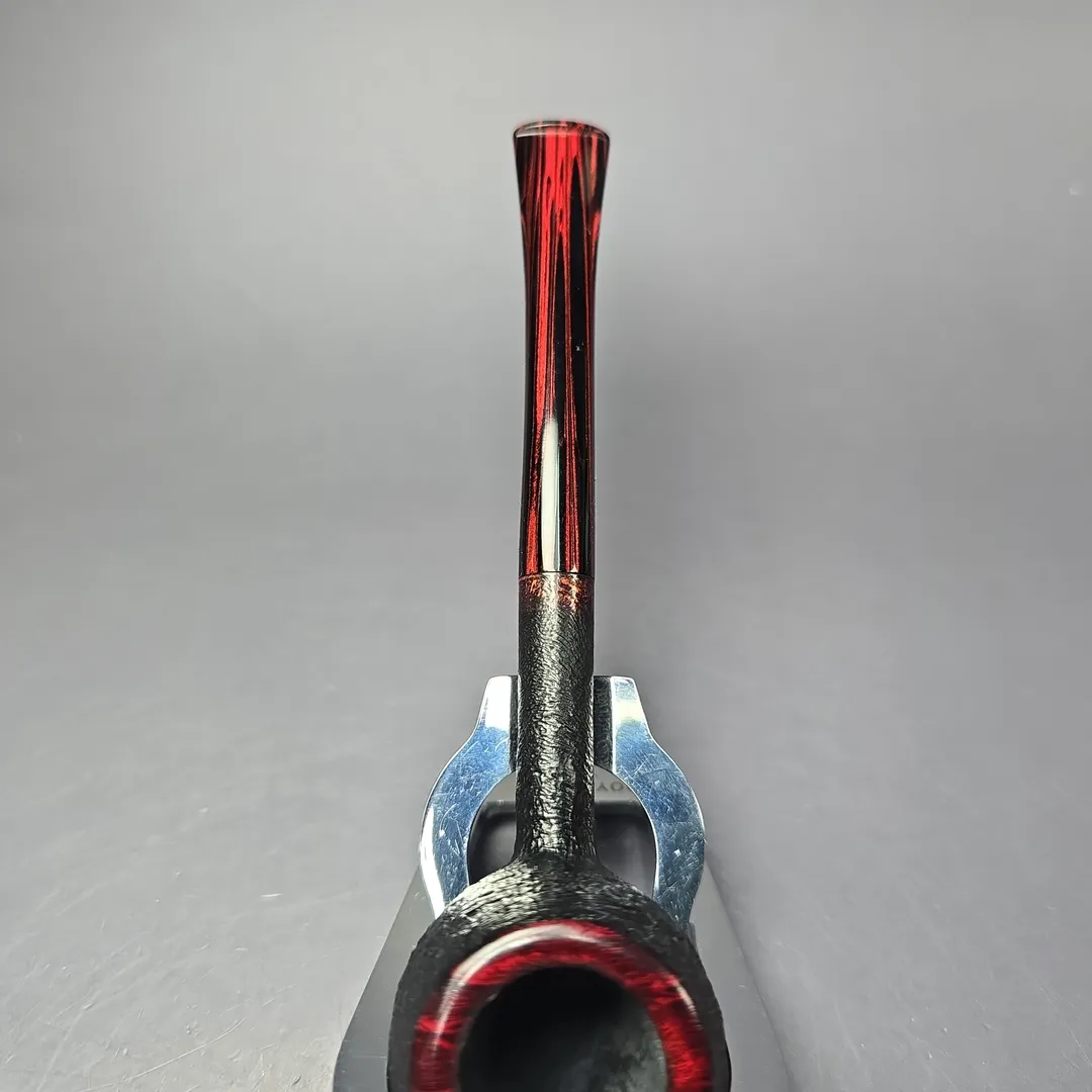Chris Herriot cut his teeth producing excellent, reserved renditions of Anglo-French classics, and it is these pipes that first brought him to prominence. In a way, one should expect nothing less than a native Brit living in France, a former student and current colleague of Bruno Nuttens, and indeed an alumnus of the Confrérie des Maîtres-Pipiers de Saint-Claude. This prince might be said to be a little more “gothic” in its color palette (it is the season, after all), though it makes sure to stay faithful to the slight and slender shaping of the traditional prince. Dressed in a reserved, near-black partial sandblast, these darker hues are offset by ruby red rim and hand-cut cumberland mouthpiece.