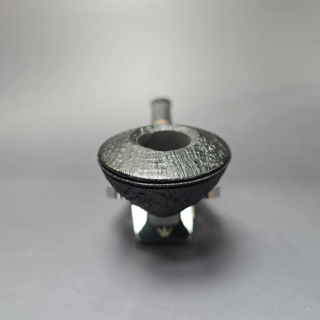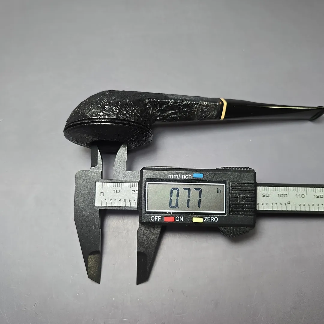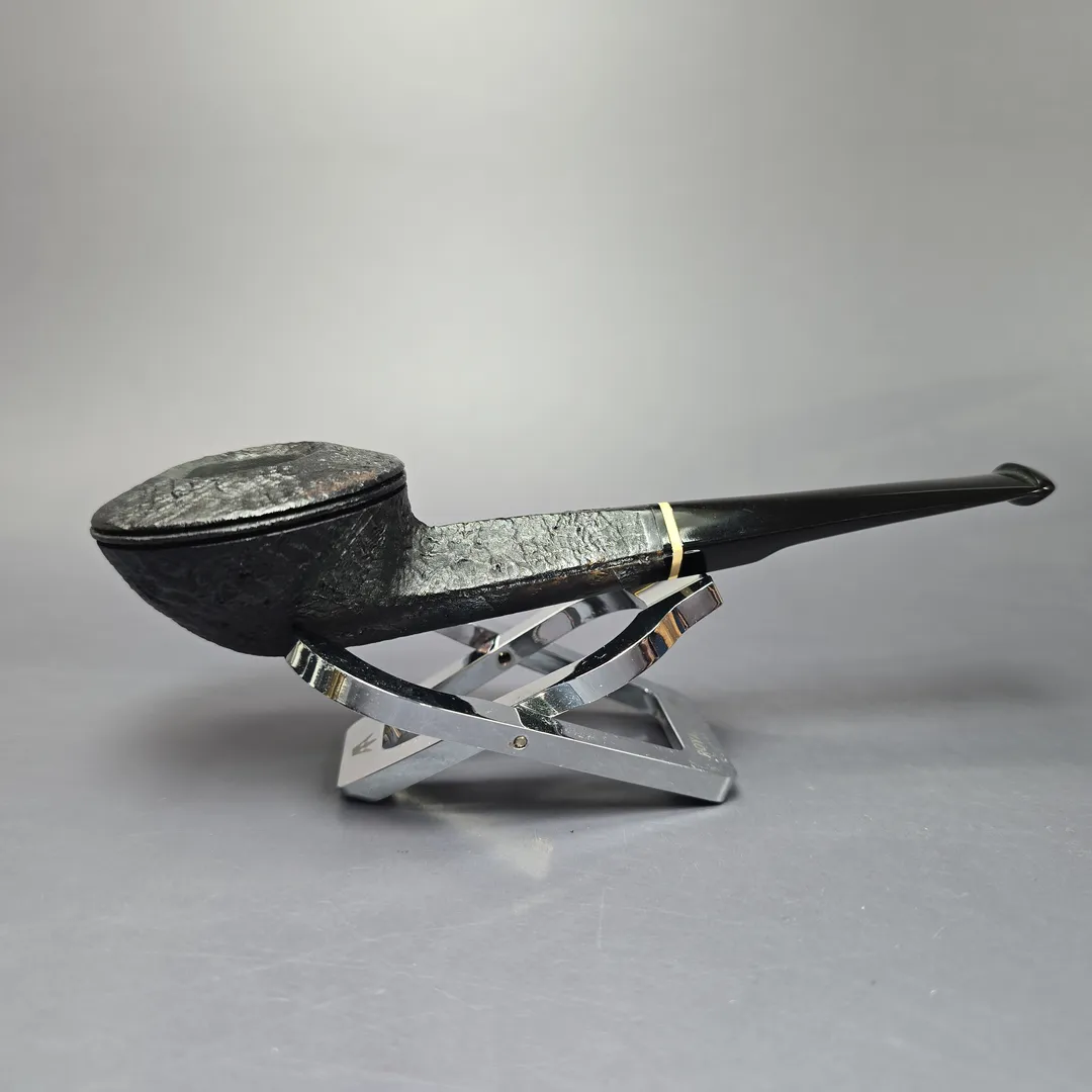 Though HS Studio largely creates “Danish” style pipes of all stripes, I have noticed that the workshop is by no means averse to more “traditional” designs. This one, for example is very traditional, taking the form of a sleek, squat bulldog, reminiscent of Anglo-French shapes at the turn of the 20th century. As an extra classical touch, it is not only dressed in a dark sandblast and fitted with a black ebonite stem, but also features a stem inlay from what I think is boxwood, but which rather evokes another, more old fashioned off-white material, one that is no longer used in pipe design (at least, not the kind harvested from sources that are only recently deceased).