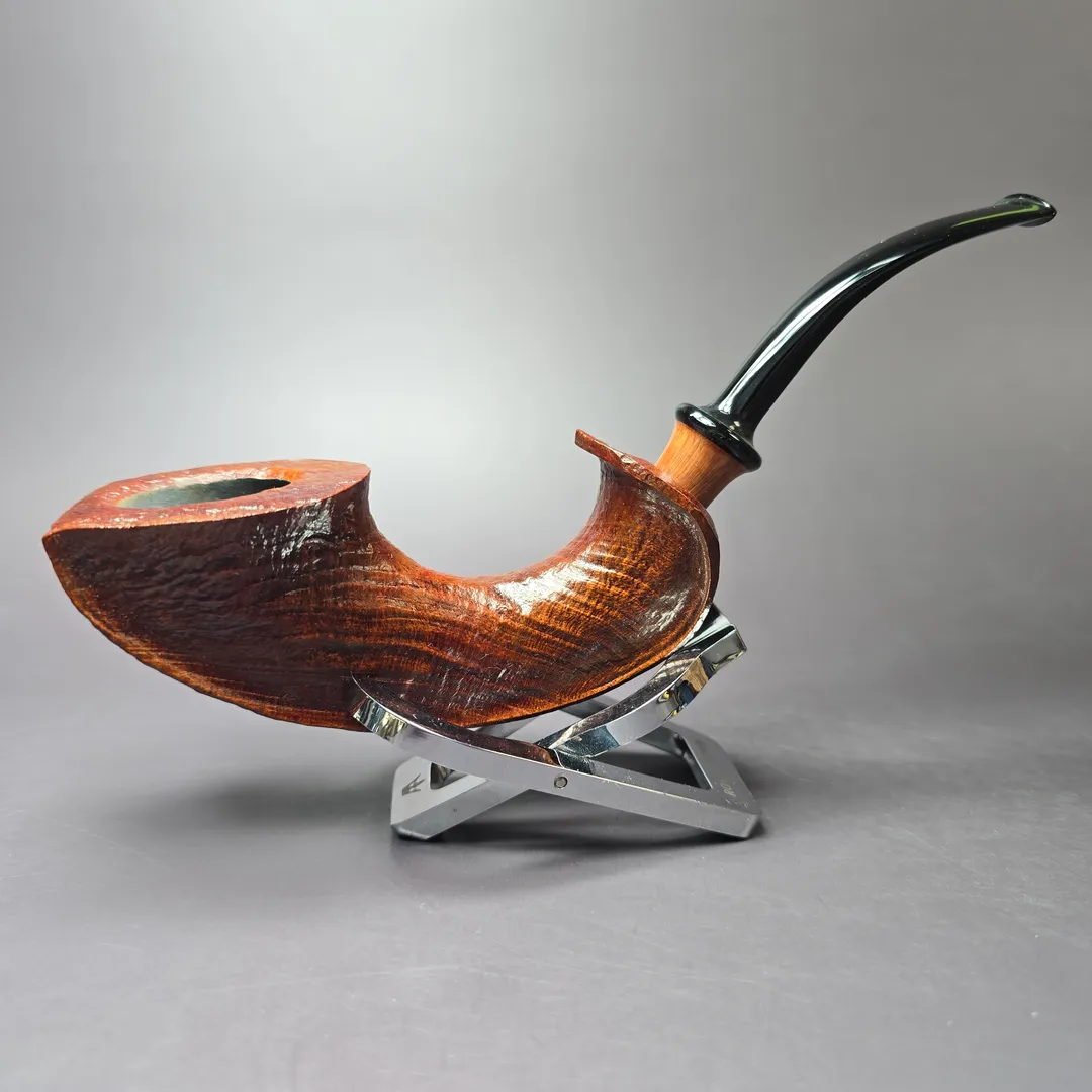 The horn is a shape born out of Scandinavian pipe making, such as in the designs of Sixten Ivarsson and Bo Nordh. This pipe, from HS Studio, is also a horn of sorts, made using the same artisanal techniques—but, as the saying goes, this is not your daddy’s horn. Less Scandinavian than perhaps Japanese, it is highly reminiscent of the style of such greats as Takeo Arita or Ichi Kitahara, with its sides folding in on themselves at every corner. It is certainly impressive and, what’s more, even manages to squeeze a good deal of ring grain into its highly unorthodox form.
