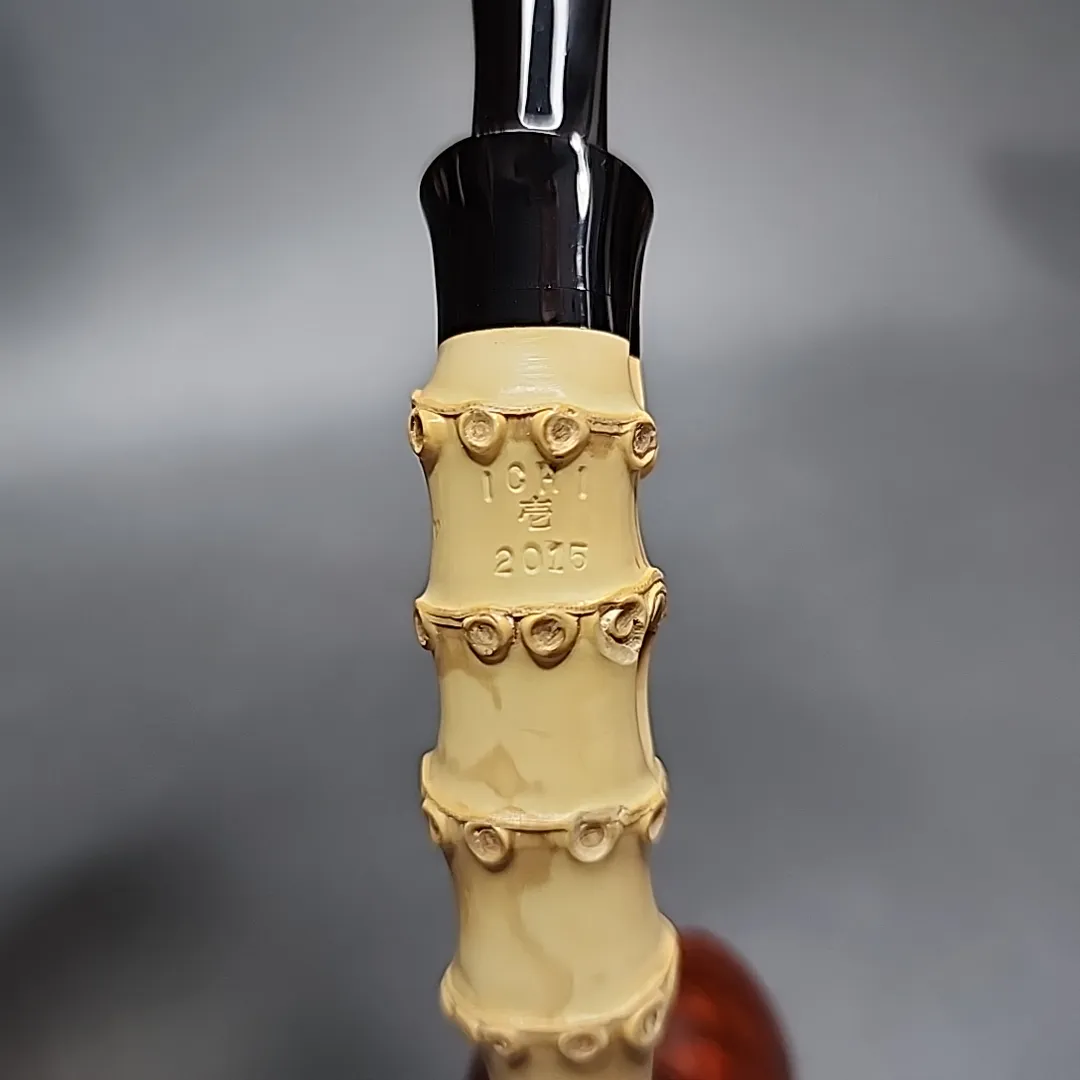 Though difficult to employ, one of the most interesting things that can be done with bamboo is creating shapes that are, in most circumstances, not able to otherwise be pulled off. While not as wild as some of the shapes bamboo can afford, this pipe from Japan’s Ichi Kitahara exhibits a curvature from bowl to button that would otherwise necessitate an awkward angling of its draft hole. This curvature along the pipe’s vertical axis is coupled with a slight bend in the pipe’s horizontal axis, allowing the pipe’s archetypal form – the blowfish – to also look as though it is “swimming.”