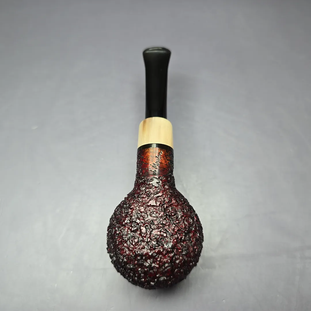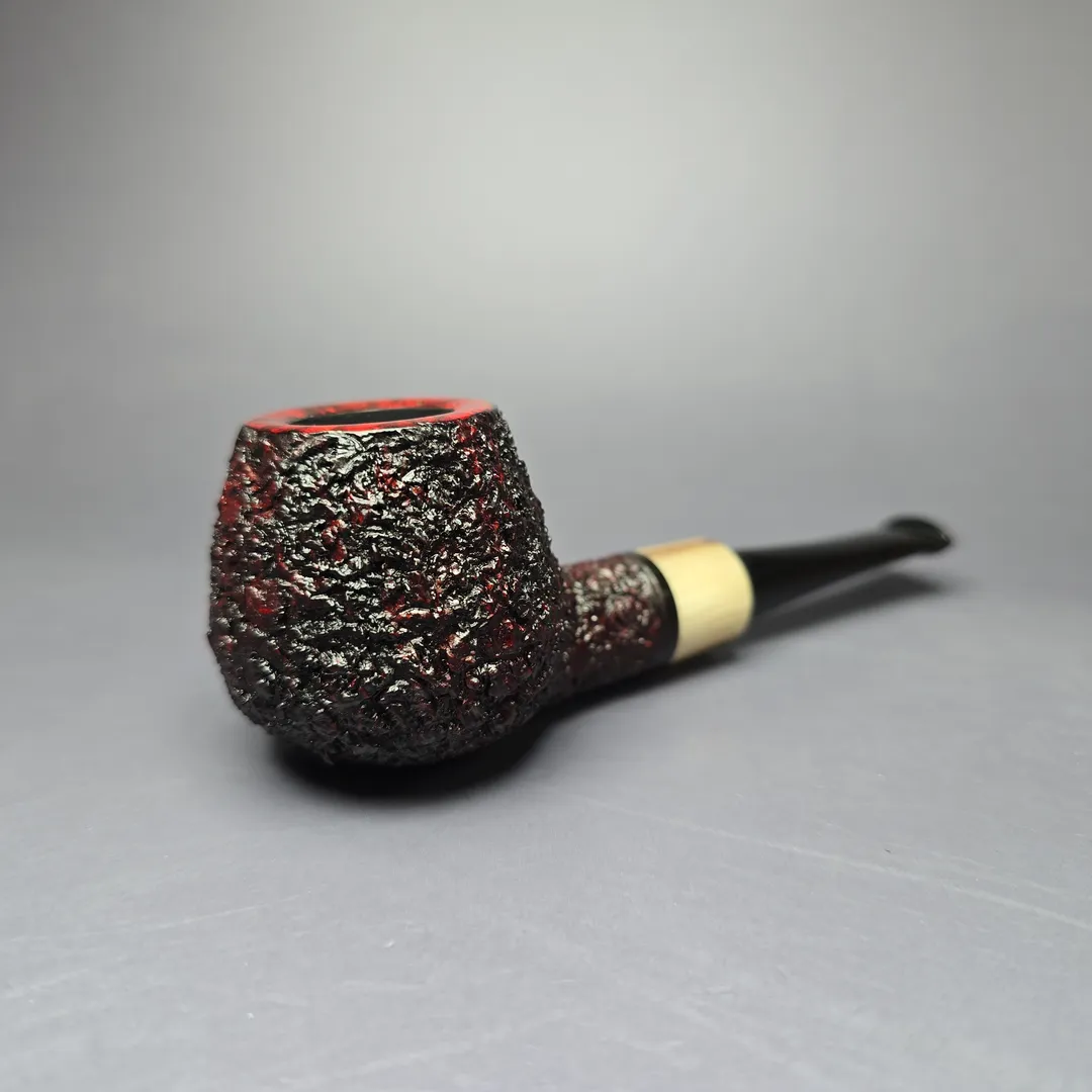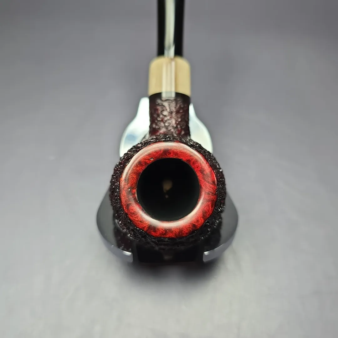 For a while in the 21st century, rustication appeared to be a lost art in the community of high-grade artisan pipes. There were a few exceptions, of course, especially in the school of pipe makers associated with Mike Butera, but they were exceptions nonetheless, rather than the rule. More recently, a variety of rustication styles have arisen, or been reborn, in artisan circles, proving once again that such finishes are not simply what one does to uncooperative briar. This pipe from Louisiana’s J. Mouton provides further proof against the latter’s assumptions, turning a plump Danish apple (very much in the vein of Former or Jess Chonowitsch) into something fresh and distinctive. Especially impressive is the reddish tint that Mouton’s managed to layer into the bowl’s otherwise near-black staining, something I haven’t seen done quite as well since Les and Dolly from Ferndown retired.
